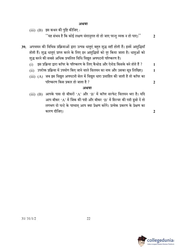 | 39. The metals produced by various reduction processes are not very pure. They contain impurities, which must be removed to obtain pure metals. The most widely used method for refining impure metals is electrolytic refining. (i) What is the cathode and anode made of in the refining of copper by this process? (ii) Name the solution used in the above process and write its formula. (iii) (A) How does copper get refined when electric current is passed in the electrolytic cell? |