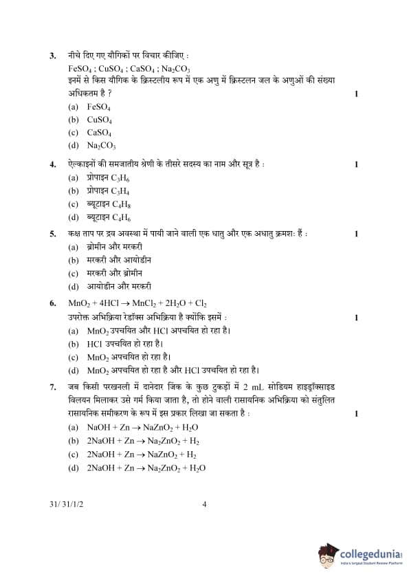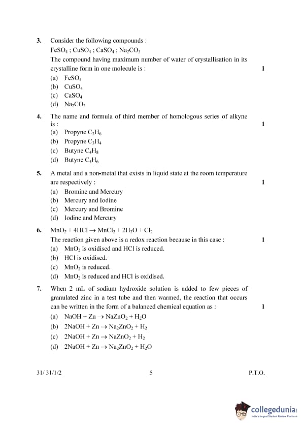 | 3. Consider the following compounds: FeSO4, CuSO4, CaSO4, Na2CO3. The compound having the maximum number of water of crystallization in its crystalline form in one molecule is: (A) FeSO4 (B) CuSO4 (C) CaSO4 (D) Na2CO3 |