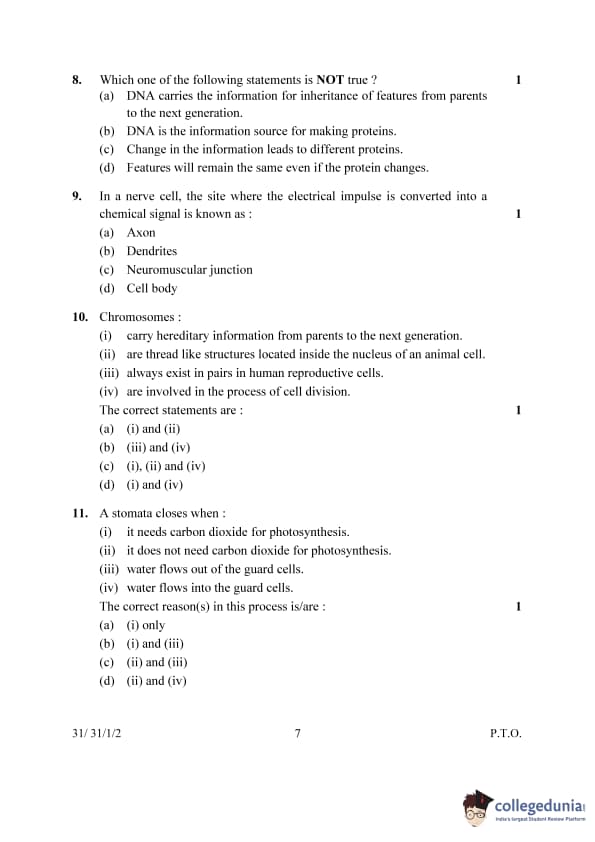 | 8. Which one of the following statements is NOT true? (A) DNA carries the information for inheritance of features from parents to the next generation. (B) DNA is the information source for making proteins. (C) Change in the information leads to different proteins. (D) Features will remain the same even if the protein changes. |