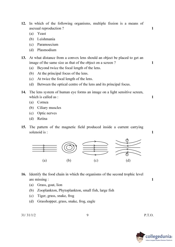 | 12. In which of the following organisms, multiple fission is a means of asexual reproduction? (A) Yeast (B) Leishmania (C) Paramecium (D) Plasmodium |