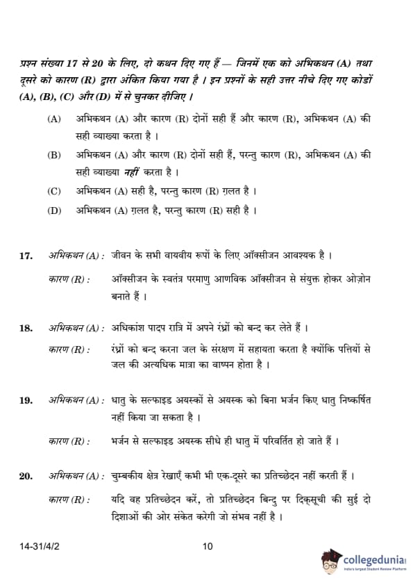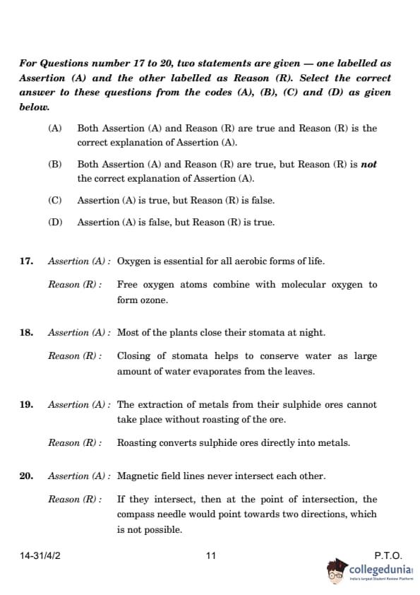 | 17. Assertion (A): Oxygen is essential for all aerobic forms of life. Reason (R): Free oxygen atoms combine with molecular oxygen to form ozone. (A) Both Assertion (A) and Reason (R) are true and Reason (R) is the correct explanation of Assertion (A). (B) Both Assertion (A) and Reason (R) are true, but Reason (R) is not the correct explanation of Assertion (A). (C) Assertion (A) is true, but Reason (R) is false. (D) Assertion (A) is false, but Reason (R) is true. |