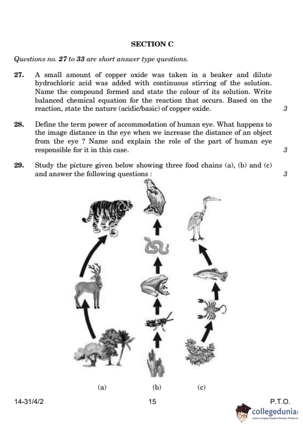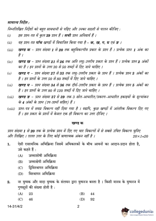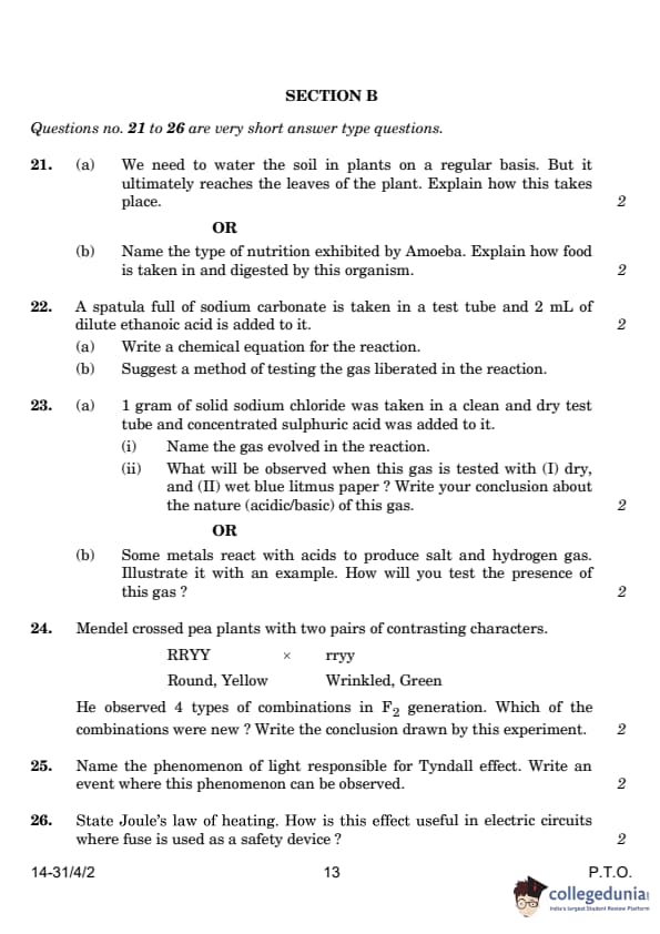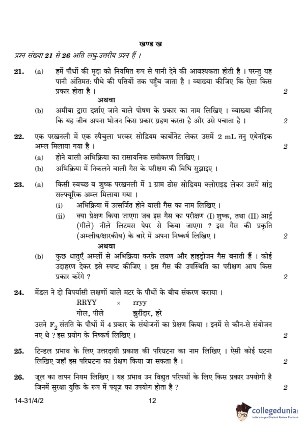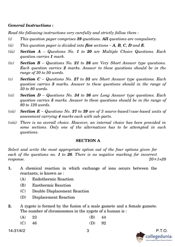 CBSE Class 10 Science Question Paper 2024 PDF (Set 2 - 31/4/2) is available for download here. CBSE conducted the Science exam on March 2, 2024, from 10:30 AM to 1:30 PM. The total marks for the theory paper are 80. The question paper contains 20% MCQ-based questions, 40% competency-based questions, and 40% short and long answer type questions.