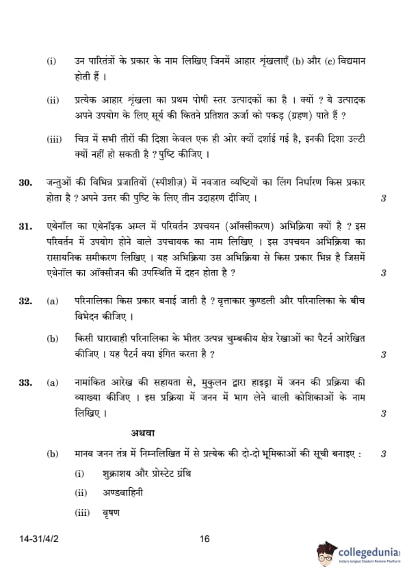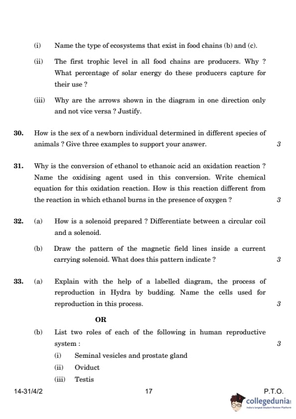 | 29. Study the picture showing three food chains and answer the following questions: (i) Name the type of ecosystems that exist in food chains (b) and (c). (ii) The first trophic level in all food chains are producers. Why? What percentage of solar energy do these producers capture for their use? (iii) Why are the arrows shown in the diagram in one direction only and not vice versa? Justify. |