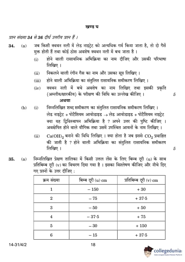 | 34. (a) When lead nitrate is heated strongly in a boiling tube, two gases are liberated, and a solid residue is left behind in the test tube. (i) Name the type of chemical reaction and define it. (ii) Write the name and formula of the coloured gas liberated. (iii) Write the balanced chemical equation for the reaction. (iv) Name the residue left in the test tube and state the method of testing its nature. |
