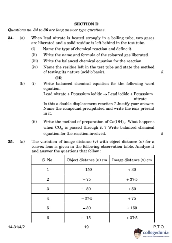 | OR 34.(b) (i) Write a balanced chemical equation for the reaction: Lead nitrate + Potassium iodide → Lead iodide + Potassium nitrate. Is this a double displacement reaction? Justify. (ii) Write the method of preparation of Ca(OH)2. What happens when CO2 is passed through it? Write the balanced chemical equation for the reaction involved. |