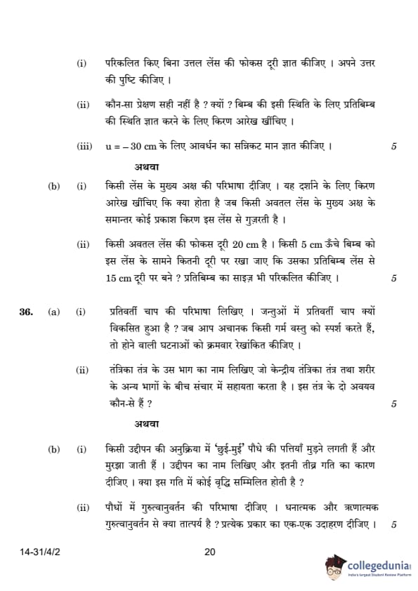| 35. (a) The variation of image distance (v) with object distance (u) for a convex lens is given below: | Object distance (u) (cm) | Image distance (v) (cm) | | -150 | +30 | | -75 | +37.5 | | -50 | +50 | | -37.5 | +75 | | -30 | +150 | | -15 | +37.5 | (i) Without calculation, find the focal length of the convex lens. Justify. (ii) Which observation is incorrect? Why? (iii) Find the approximate magnification for u = -30 cm. |