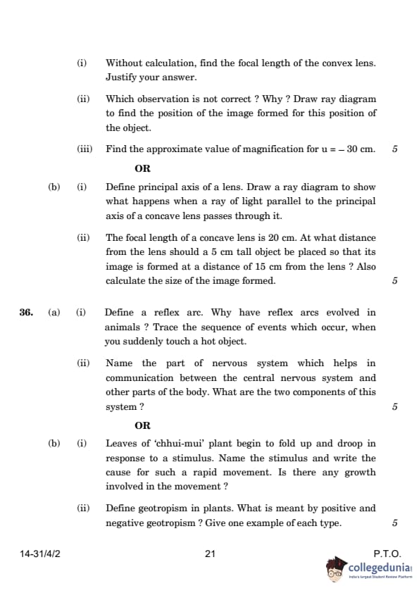 | OR 36.(b) (i) Leaves of the 'chhui-mui' plant begin to fold up and droop in response to a stimulus. Name the stimulus and write the cause for such a rapid movement. Is there any growth involved in the movement? (ii) Define geotropism in plants. What is meant by positive and negative geotropism? Give one example of each type. |