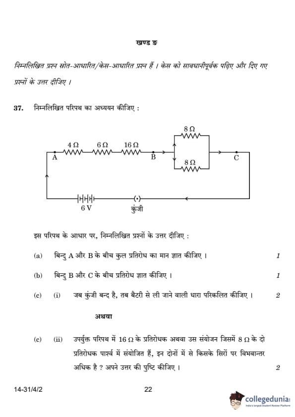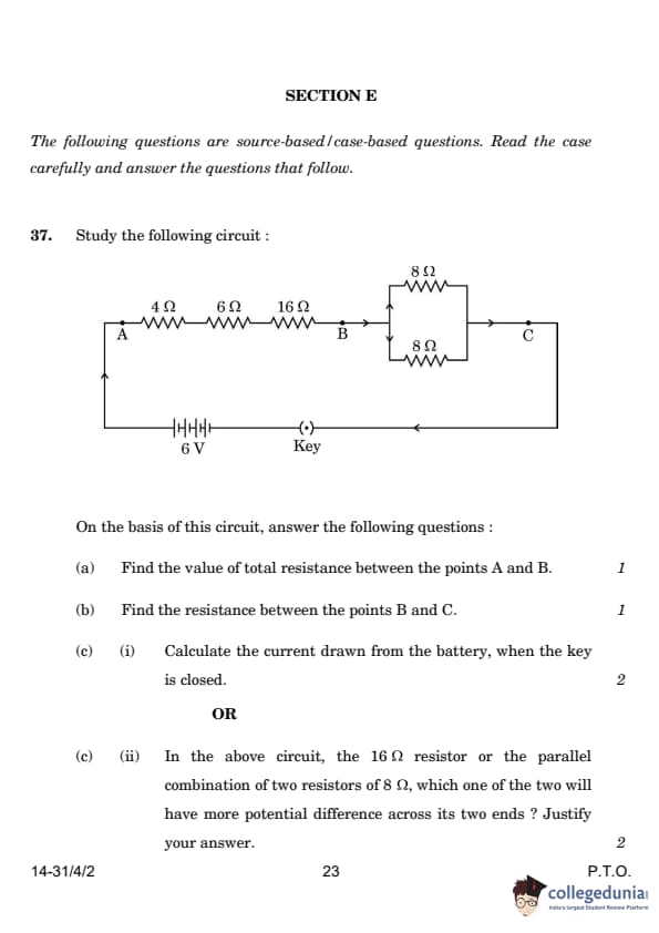 | OR 37.(c) (ii) In the above circuit, which will have more potential difference across its ends: the 16 Ω resistor or the parallel combination of two 8 Ω resistors? Justify your answer. | 16 Ω | (c) (ii) The 16 Ω resistor will have a larger potential difference across its ends because it has a greater resistance compared to the parallel combination of two 8 Ω resistors. In a series circuit, ( V = IR ), and the higher resistance gets a larger share of the total voltage. |