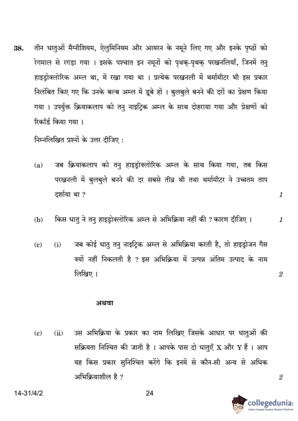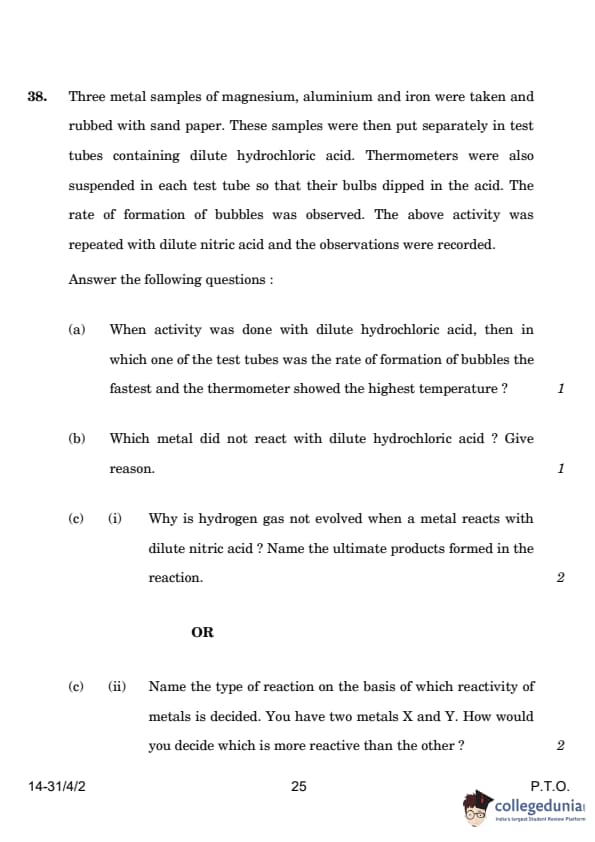 | OR 38.(c) (ii) Name the type of reaction on which the reactivity of metals is based. How would you determine which metal is more reactive: X or Y? | Displacement reaction | (c) (ii) Reaction: Displacement. Metal X and Y are tested by placing them in each other's salt solutions. The more reactive metal will displace the other from its salt solution. |
