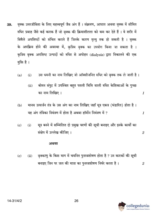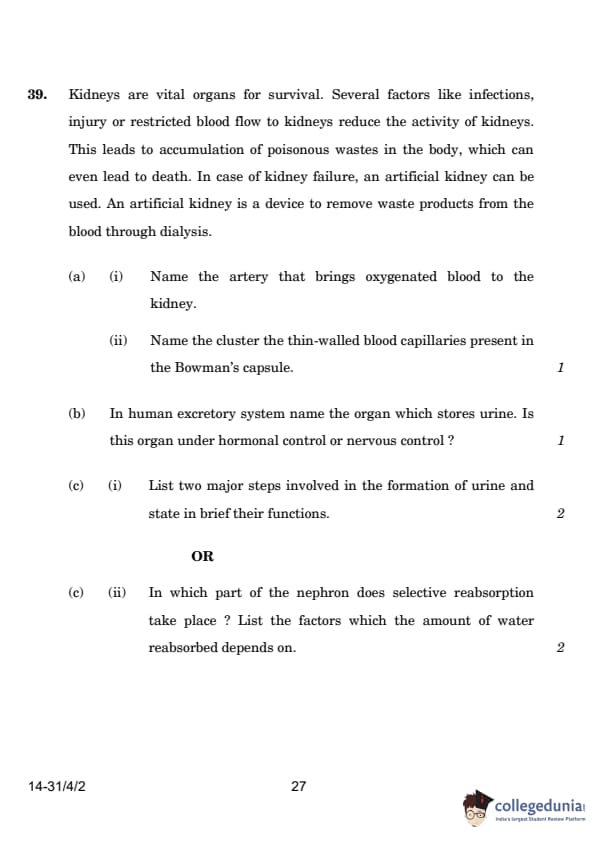 | 39. Kidneys are vital for survival. Several factors can reduce their function, leading to waste accumulation and death. In case of failure, an artificial kidney is used for dialysis. (a) (i) Name the artery that brings oxygenated blood to the kidney. (ii) Name the cluster of blood capillaries in the Bowman’s capsule. (b) Name the organ that stores urine. Is this organ under hormonal or nervous control? (c) (i) List two major steps involved in the formation of urine and their functions. |