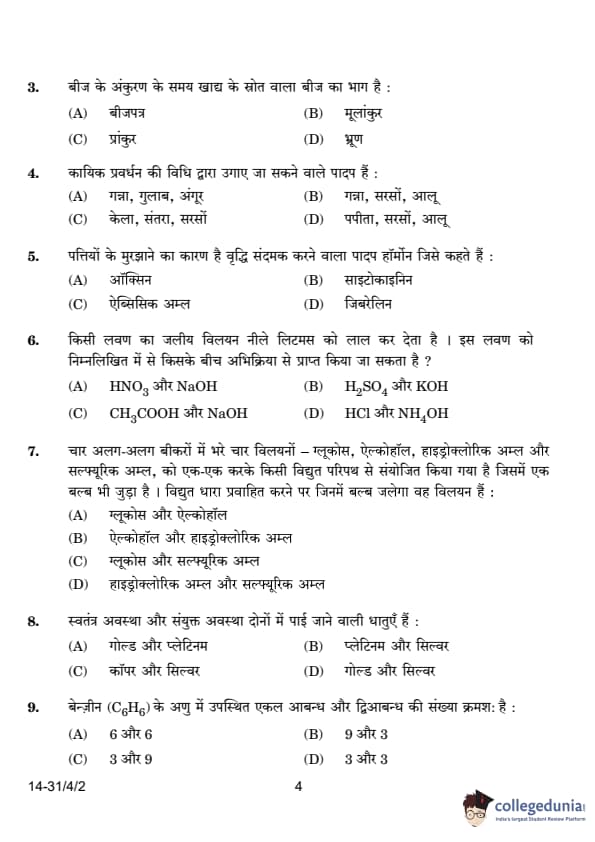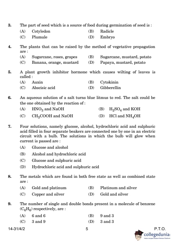 | 9. The number of single and double bonds present in a molecule of benzene (C6H6) respectively, are: (A) 6 and 6 (B) 9 and 3 (C) 3 and 9 (D) 3 and 3 |
