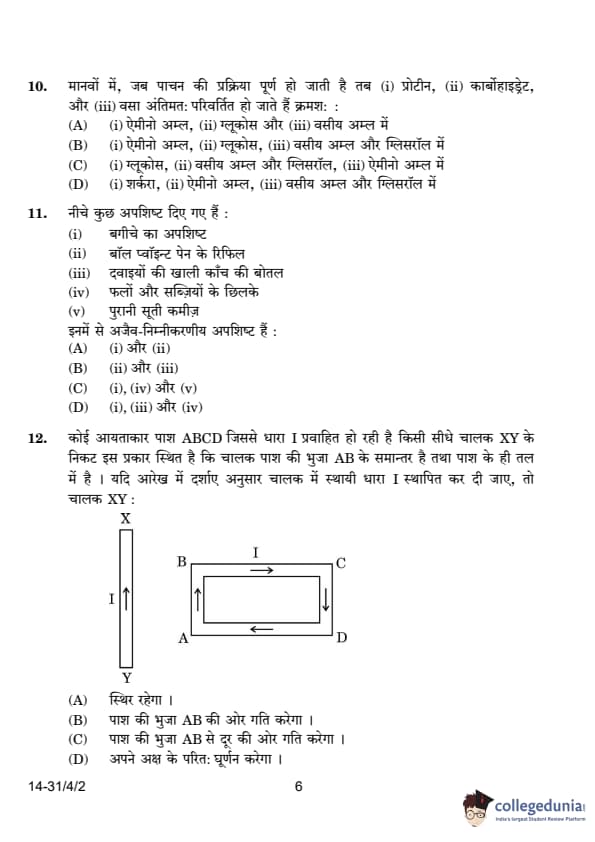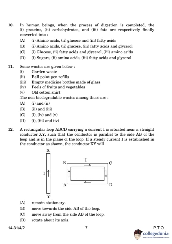 | 10. In human beings, when the process of digestion is completed, the (i) proteins, (ii) carbohydrates, and (iii) fats are respectively converted into: (A) (i) Amino acids, (ii) glucose, and (iii) fatty acids (B) (i) Amino acids, (ii) glucose, and (iii) fatty acids and glycerol (C) (i) Glucose, (ii) fatty acids and glycerol, and (iii) amino acids (D) (i) Sugars, (ii) amino acids, and (iii) fatty acids and glycerol |