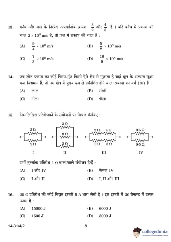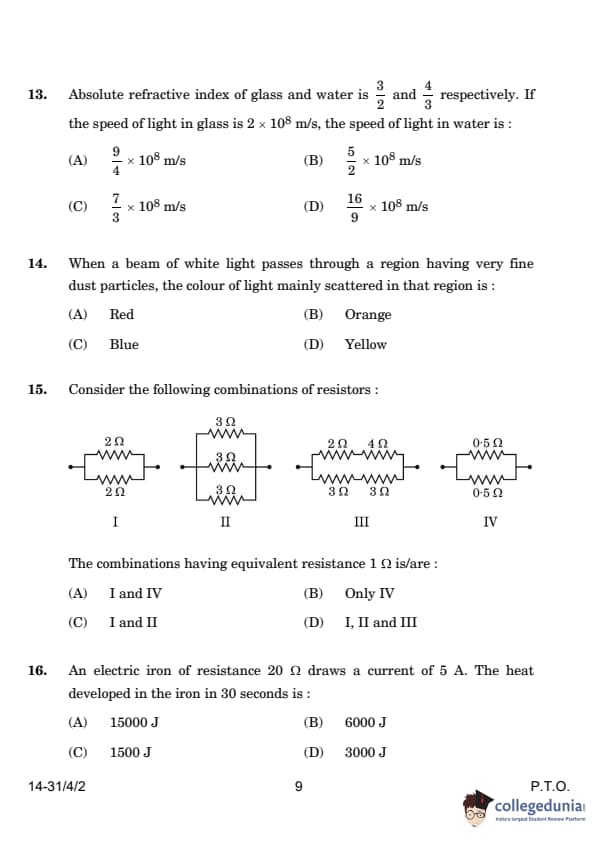 | 13. Absolute refractive index of glass is 3/2 and water is 4/3. If the speed of light in glass is 2 × 108 m/s, the speed of light in water is: (A) 9/4 × 108 m/s (B) 5/2 × 108 m/s (C) 7/3 × 108 m/s (D) 16/9 × 108 m/s |
