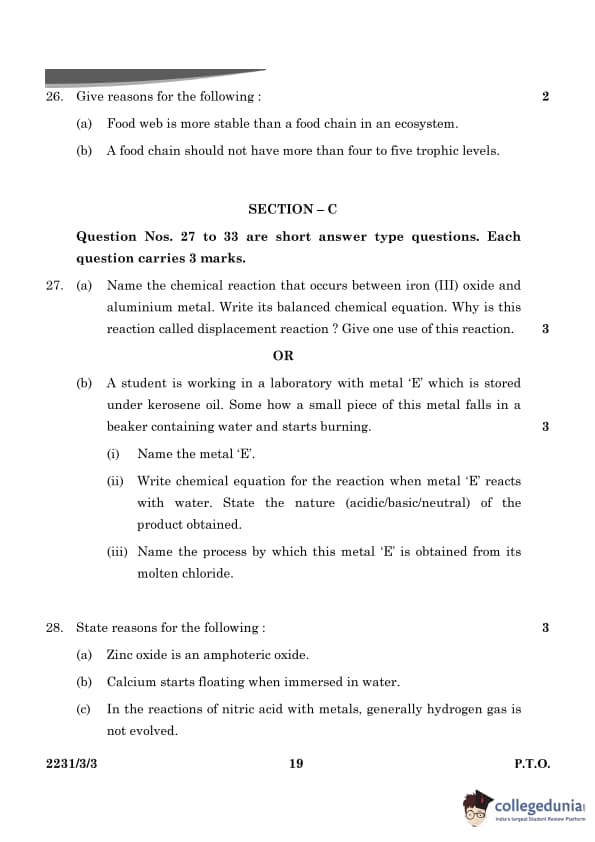 | 27. (a) Name the chemical reaction that occurs between iron (III) oxide and aluminium metal. Write its balanced chemical equation. Why is this reaction called a displacement reaction? Give one use of this reaction. |
