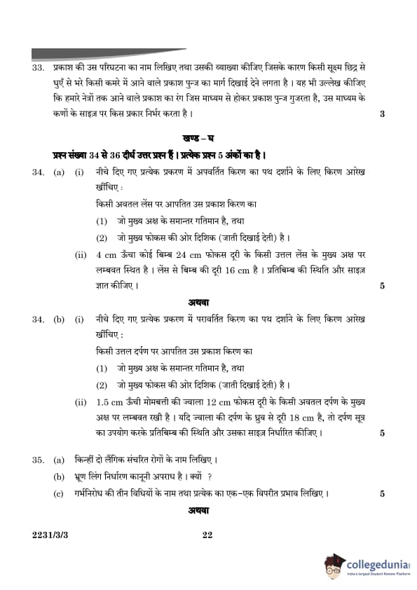 | OR 34. (b) (i) Draw a ray diagram to show the path of the reflected ray in each of the following cases: A ray of light incident on a convex mirror (1) parallel to its principal axis, and (2) is directed towards its principal focus. (b) (ii) A 1.5 cm tall candle flame is placed perpendicular to the principal axis of a concave mirror of focal length 12 cm. If the distance of the flame from the pole of the mirror is 18 cm, use the mirror formula to determine the position and size of the image formed. |