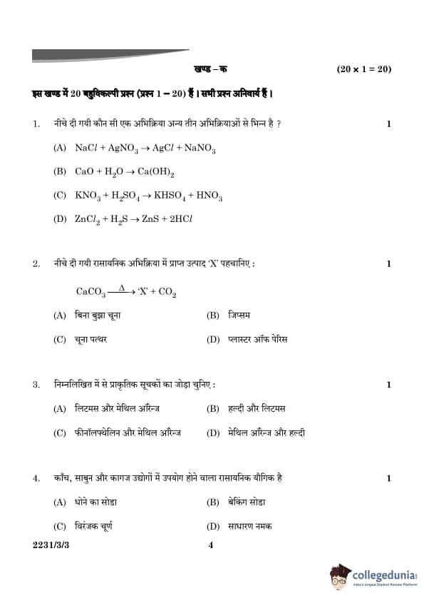 | 4. A chemical compound used in glass, soap, and paper industries is: (A) Washing Soda (B) Baking Soda (C) Bleaching Powder (D) Common Salt |