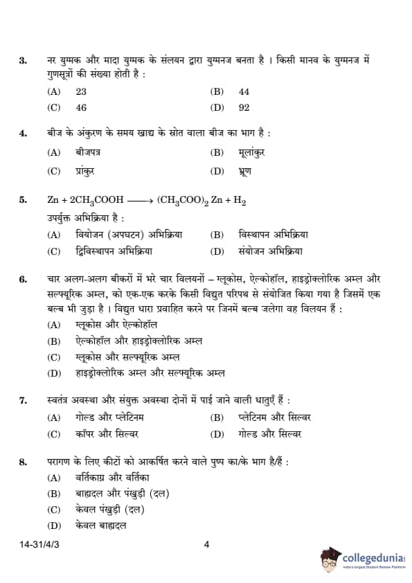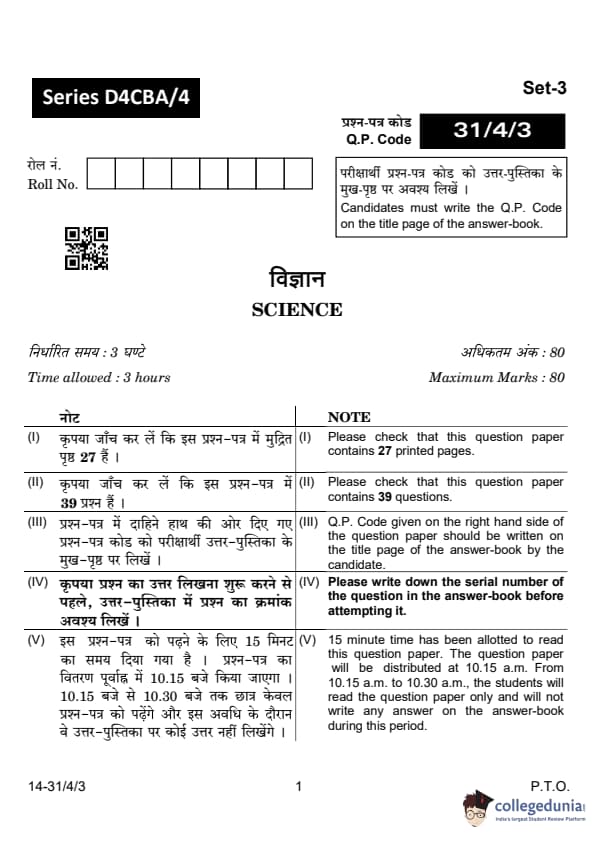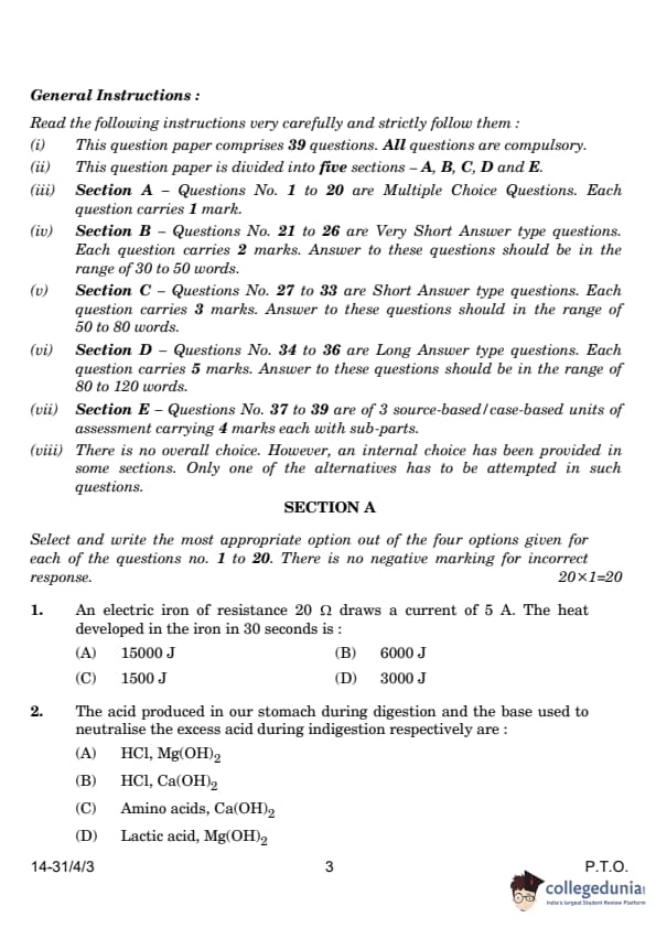 CBSE Class 10 Science Question Paper 2024 PDF (Set 3 - 31/4/3) is available for download here. CBSE conducted the Science exam on March 2, 2024, from 10:30 AM to 1:30 PM. The total marks for the theory paper are 80. The question paper contains 20% MCQ-based questions, 40% competency-based questions, and 40% short and long answer type questions.