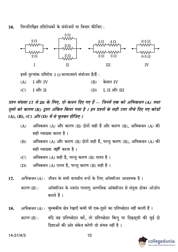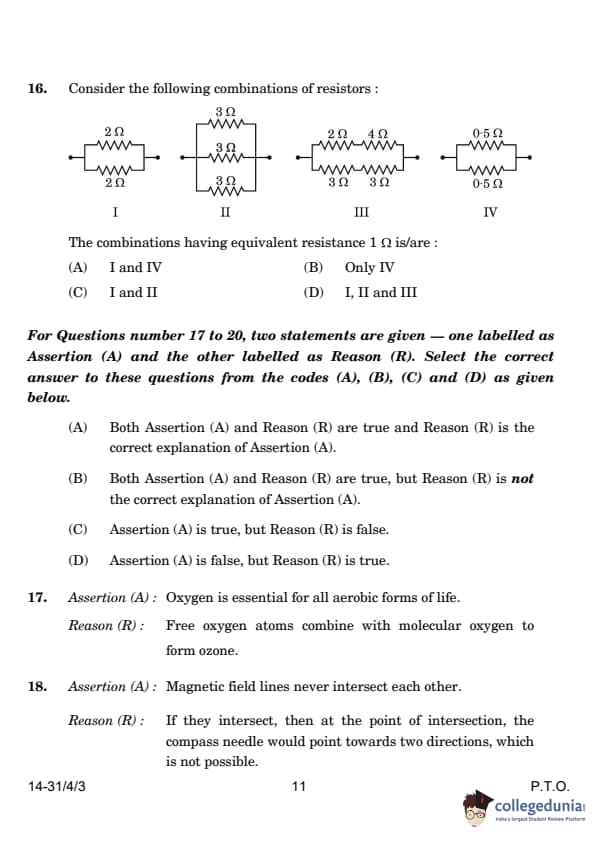 | 16. Consider the following combinations of resistors: The combinations having equivalent resistance 1Ω is/are: (A) I and IV (B) Only IV (C) I and II (D) I, II and III |