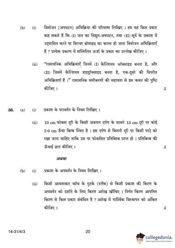 | OR 36.(b) (i) State the laws of refraction of light. | Two laws of refraction | (1) The incident ray, the refracted ray, and the normal to the surface at the point of incidence all lie in the same plane. (2) The ratio of the sine of the angle of incidence to the sine of the angle of refraction is constant (Snell’s Law): sin(i)/sin(r) = n (refractive index). |