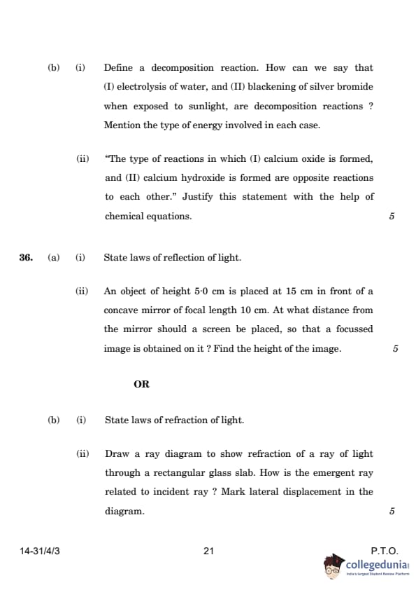 | (b) (i) Define a decomposition reaction. How can we say that (I) electrolysis of water, and (II) blackening of silver bromide when exposed to sunlight, are decomposition reactions? Mention the type of energy involved in each case. | Breakdown of compounds; Electrical and Light energy | A decomposition reaction is one where a single compound breaks into two or more simpler substances. (I) Electrolysis of water: H2O → H2 + O2 - Decomposition due to electrical energy. (II) Blackening of silver bromide: 2AgBr → 2Ag + Br2 - Decomposition due to light energy. |