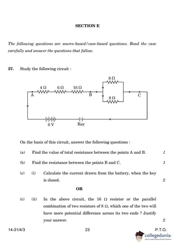 | 37.c.(ii) Compare the potential difference across the 16 Ω resistor and the parallel combination of two 8 Ω resistors. | Potential difference across 16 Ω is higher | The 16 Ω resistor will have a higher potential difference as it has a higher resistance compared to the parallel combination of the two 8 Ω resistors. V = IR applies. |