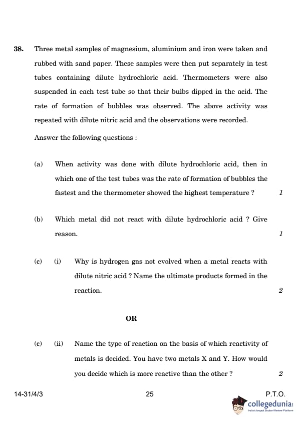 | 38. Three metal samples (magnesium, aluminum, and iron) were reacted with dilute hydrochloric acid, and the following questions were asked: (a) In which test tube will the rate of bubble formation be the fastest, and why? (b) Which metal does not react with dilute HCl? Give a reason. (c) (i) Why is hydrogen gas not evolved when metals react with dilute nitric acid? |