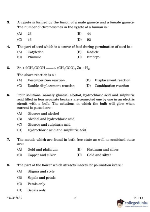 | 5. Zn + 2CH3COOH → (CH3COO)2Zn + H2 The above reaction is a: (A) Decomposition reaction (B) Displacement reaction (C) Double displacement reaction (D) Combination reaction |