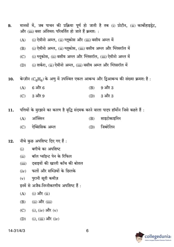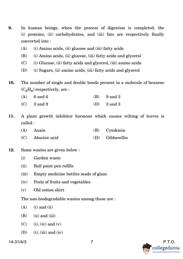 | 12. Some wastes are given below: (i) Garden waste (ii) Ball point pen refills (iii) Empty medicine bottles made of glass (iv) Peels of fruits and vegetables (v) Old cotton shirt The non-biodegradable wastes among these are: (A) (i) and (ii) (B) (ii) and (iii) (C) (i), (iv) and (v) (D) (i), (iii) and (iv) |