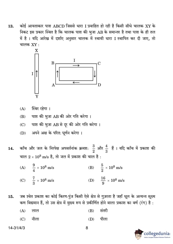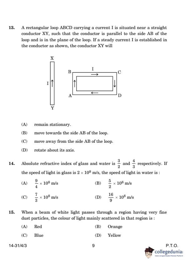 | 13. A rectangular loop carrying a current I is situated near a straight conductor carrying current. The straight conductor will: (A) Remain stationary (B) Move towards the loop (C) Move away from the loop (D) Rotate about its axis |