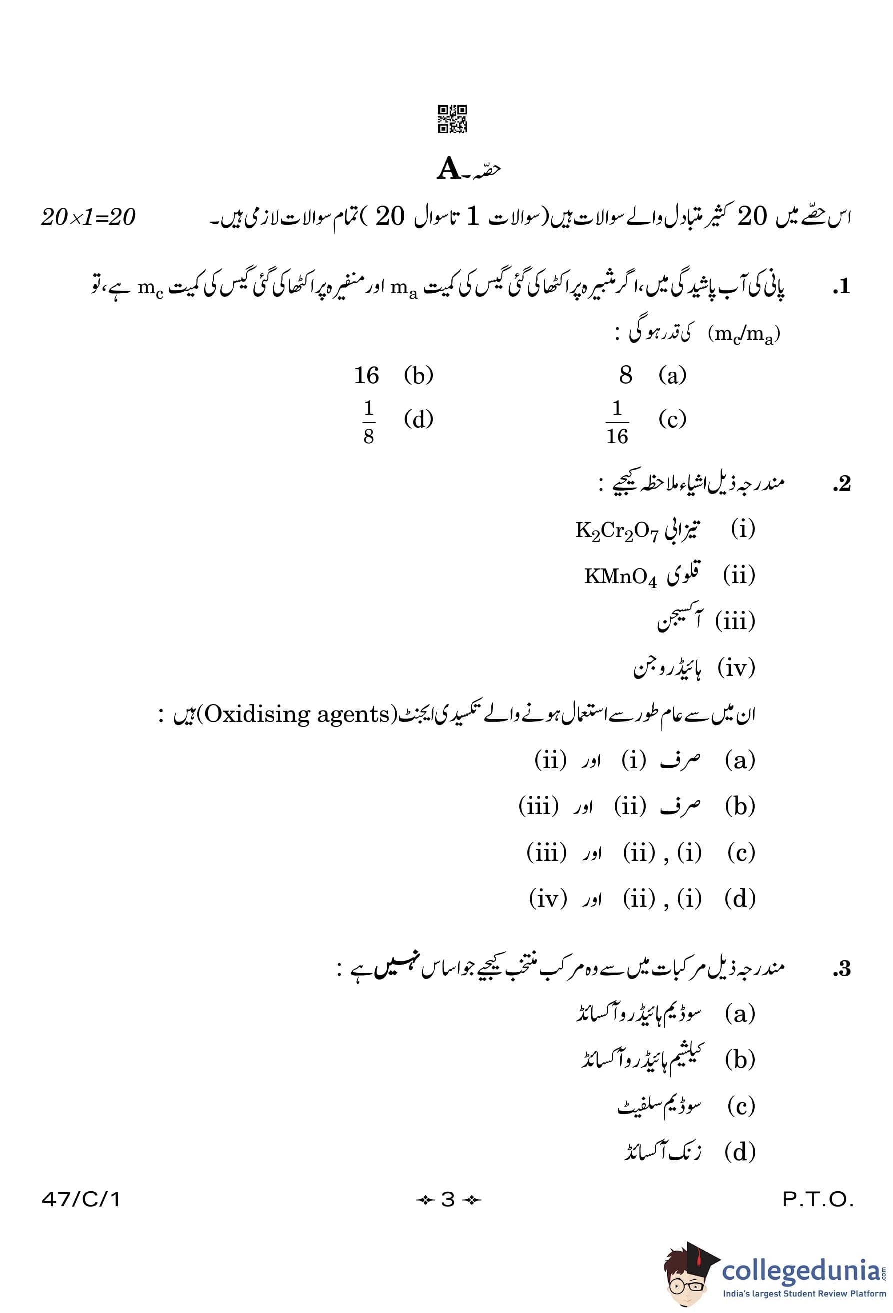 CBSE Class 10 Science (Urdu) (Set 1- 47/C/1) Compartment Question Paper 2023 with Answer Key