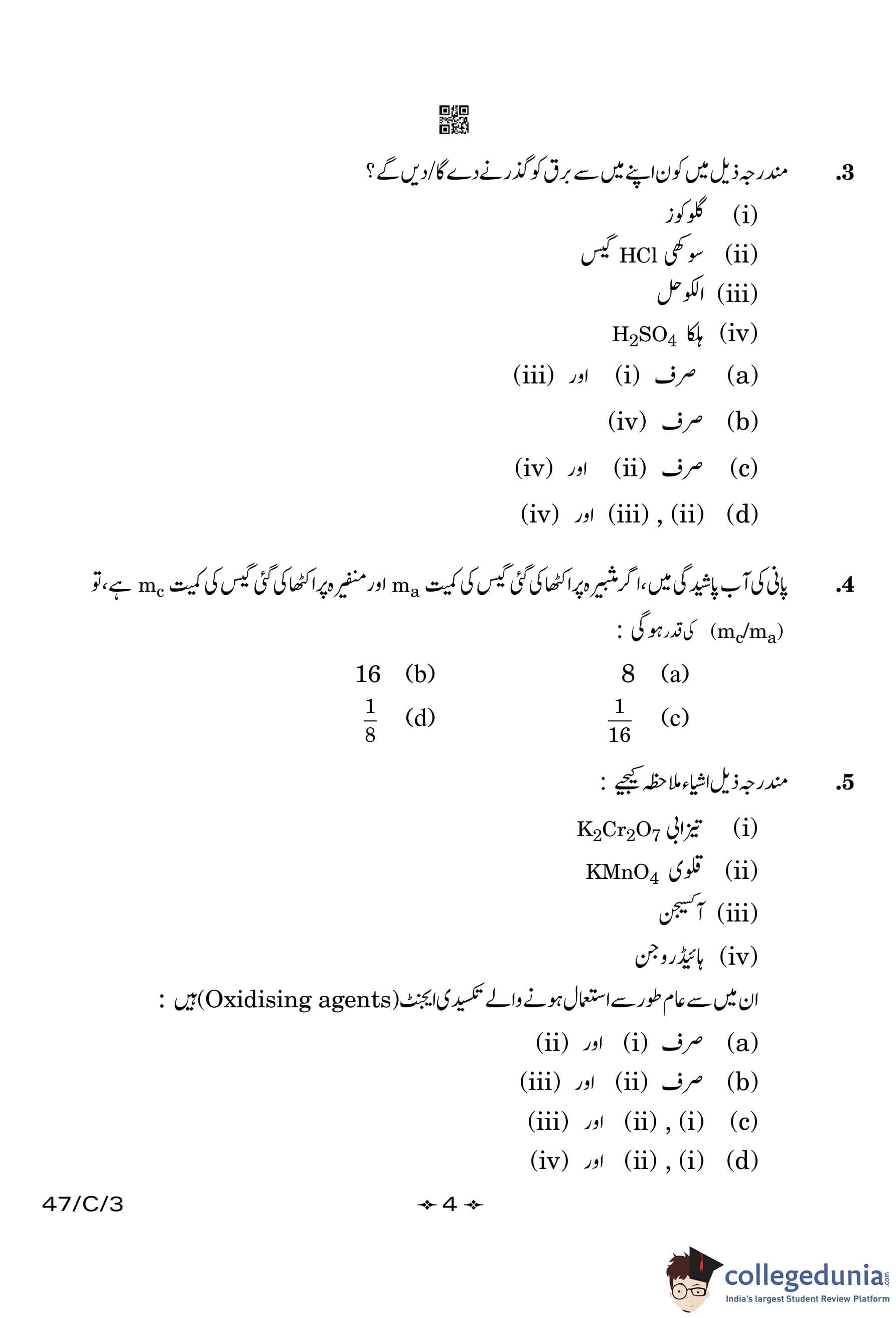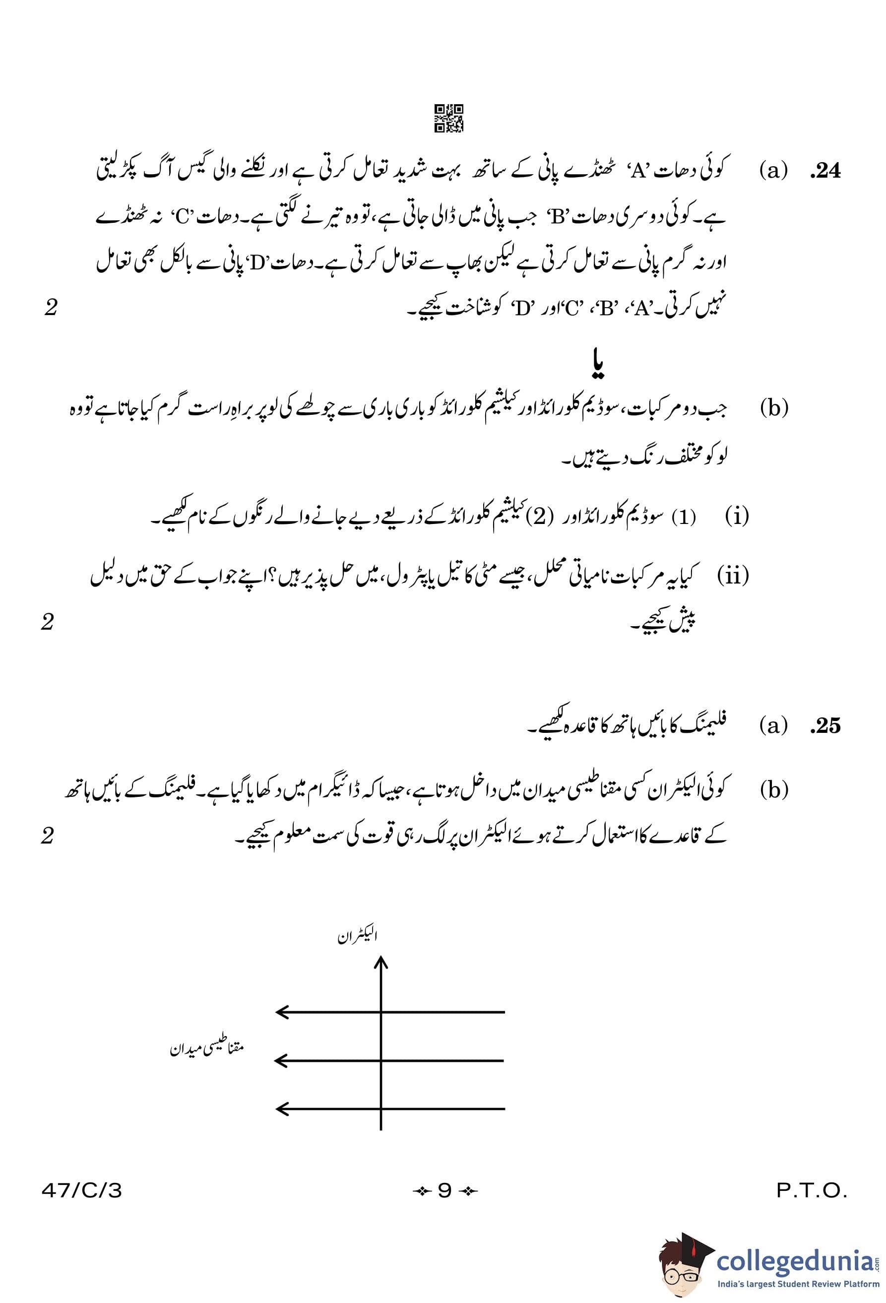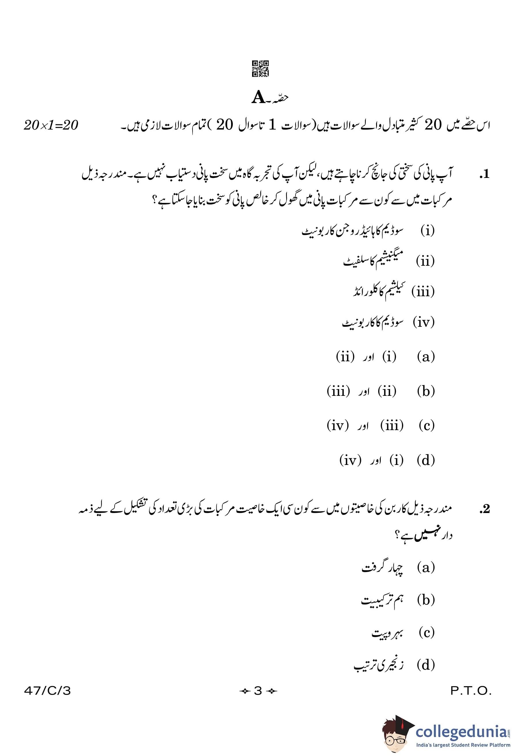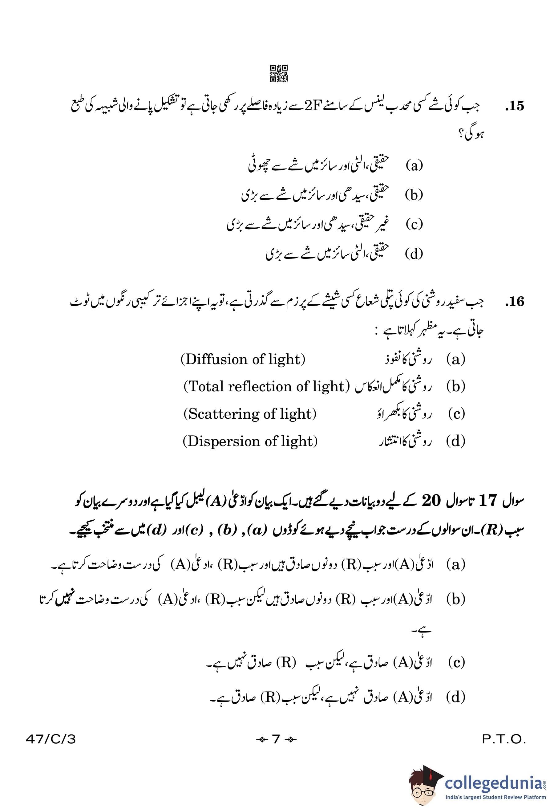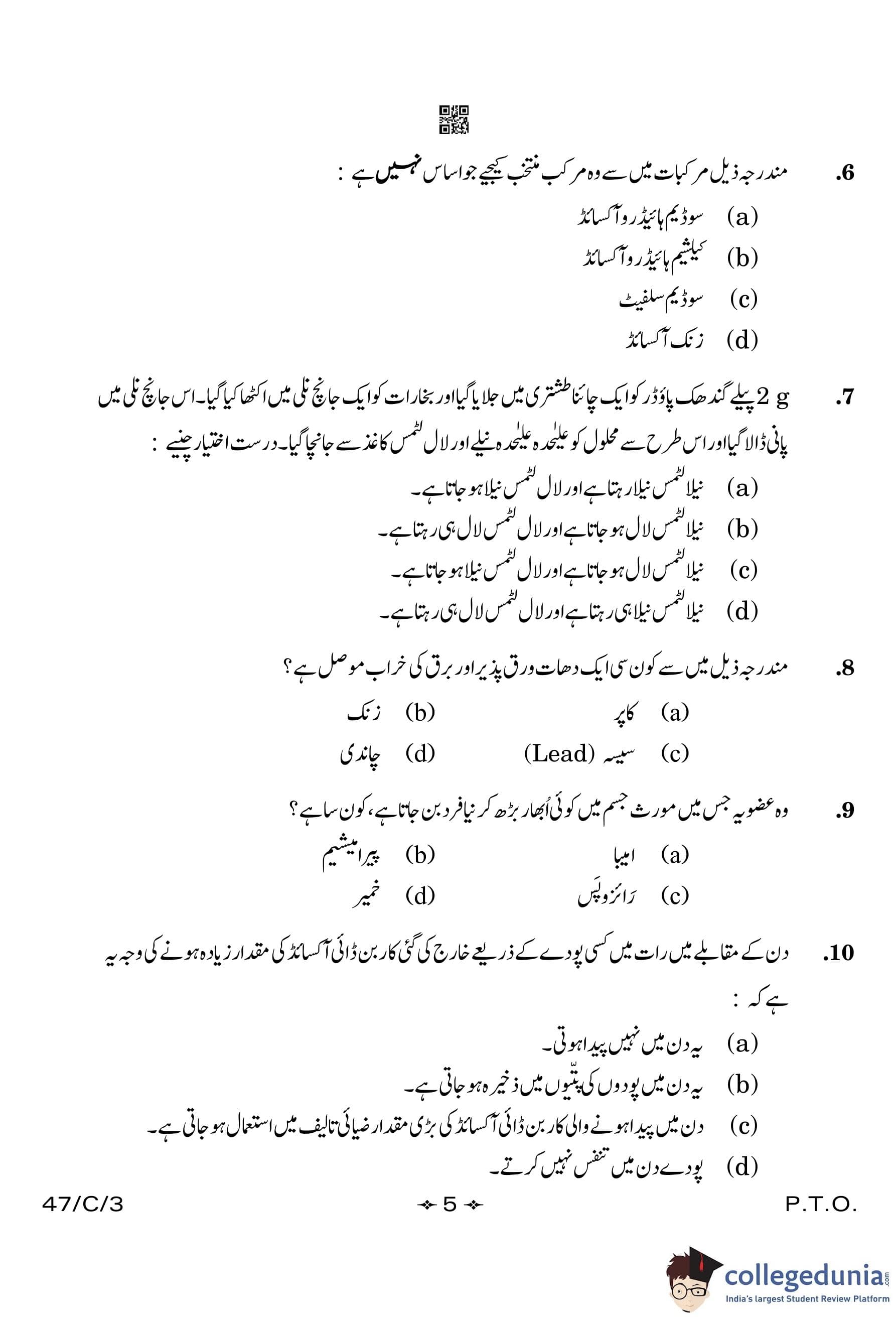 CBSE Class 10 Science (Urdu) (Set 3- 47/C/3) Compartment Question Paper 2023 with Answer Key
