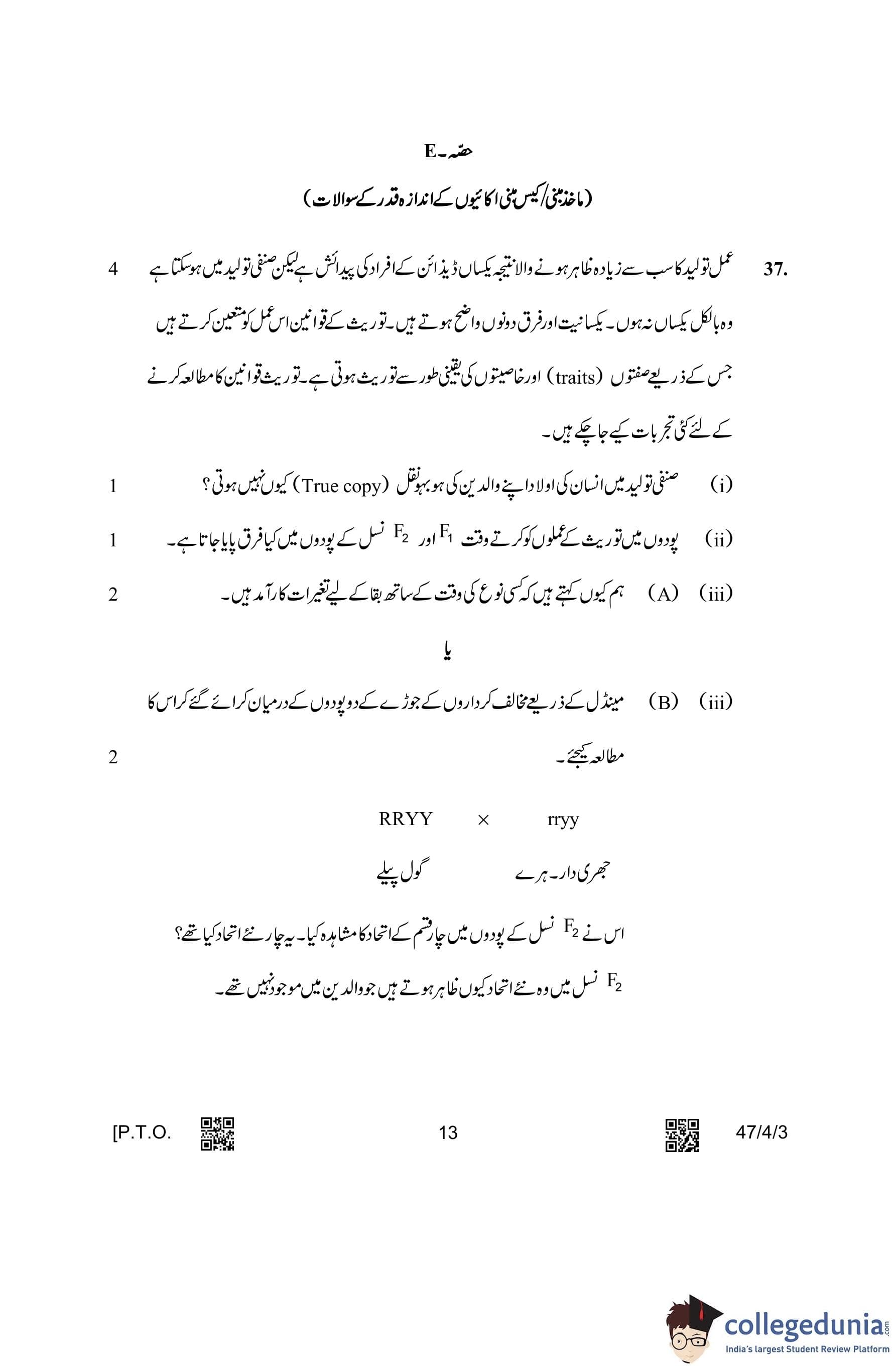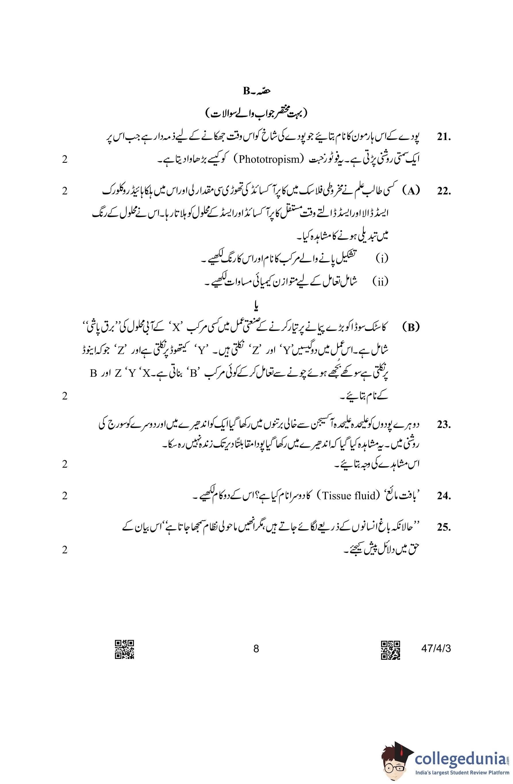 CBSE Class 10 Science Urdu Question Paper 2023 with Answer Key (Set 3- 47/4/3) is available for download here. The exam was conducted by the Central Board of Secondary Education on March 4, 2023 in the Morning Session 10:30 AM to 1:30 PM. The medium of paper was Urdu. According to initial student reaction, the CBSE Class 12 Science Paper was rated as Moderate in difficulty level. The question paper comprised a total of 39 questions divided among 5 sections.