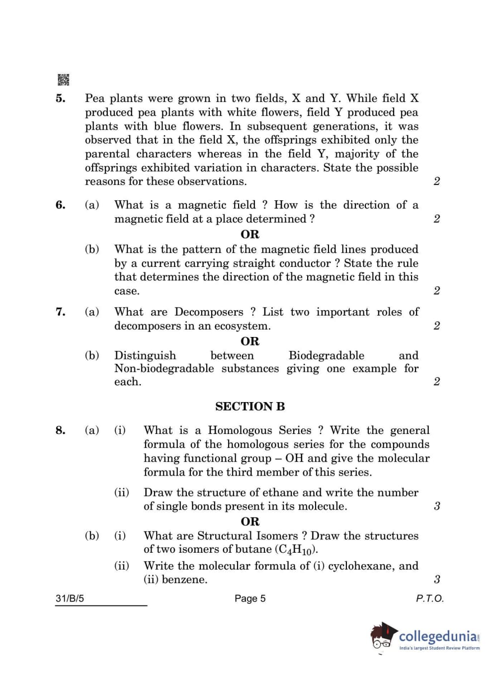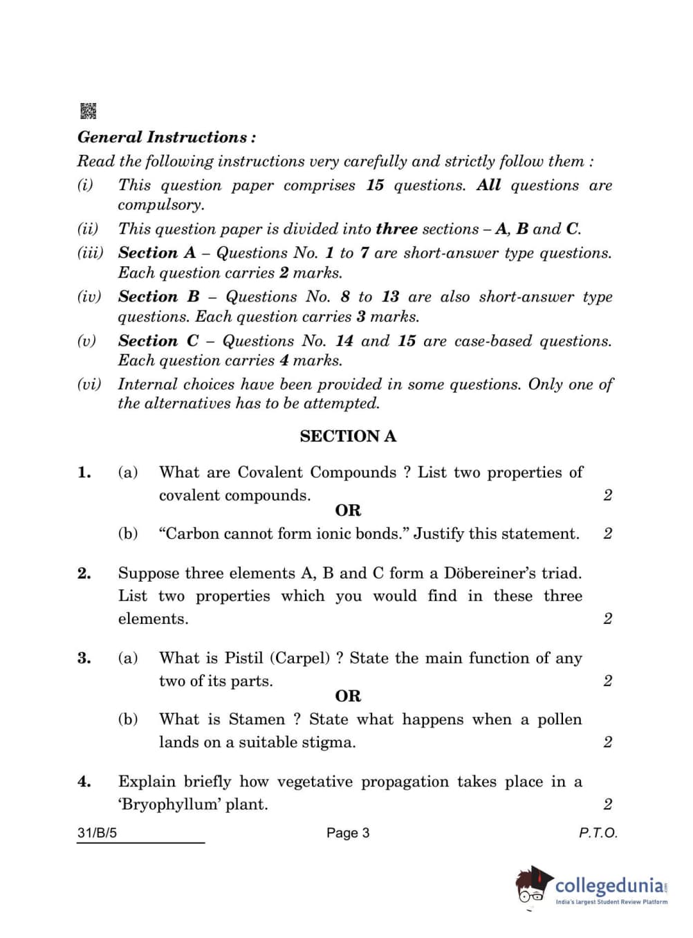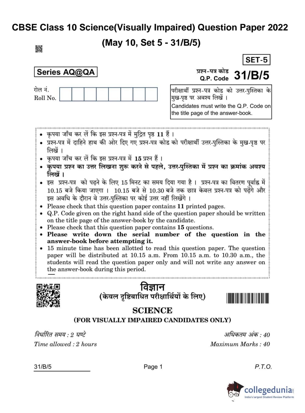 CBSE Class 10 Science(Visually Impaired) Question Paper 2022 with Answer Key Set 5 - 31/B/5 is available for download. The exam was conducted by the Central Board of Secondary Education on May 10, 2022 in the Morning Session 10:30 AM to 12:30 PM. The medium of paper was English & Hindi. The question paper comprised a total of 15 questions divided among 3 sections.