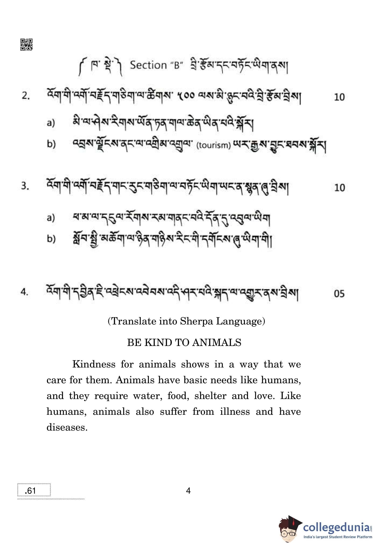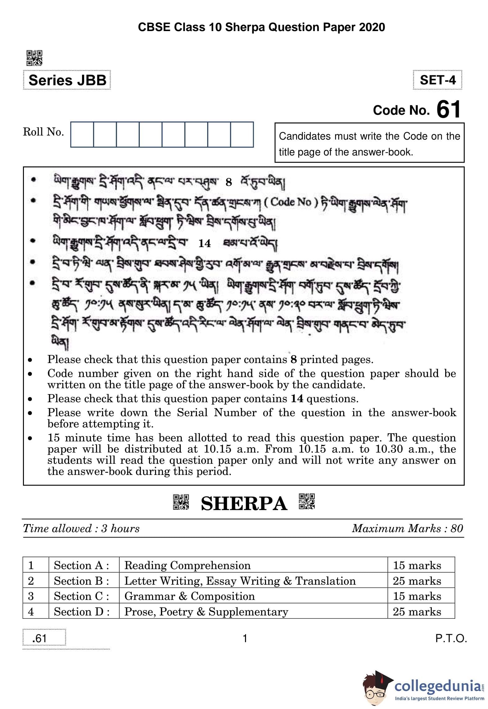 CBSE Class 10 Sherpa Question Paper 2020 with Answer Key Set 4 is available for download. The exam was conducted by the Central Board of Secondary Education on February 24, 2020 in the Morning Session 10:30 AM to 1:30 PM. The medium of paper was Sherpa. The question paper comprised a total of 14 questions divided among 4 sections.