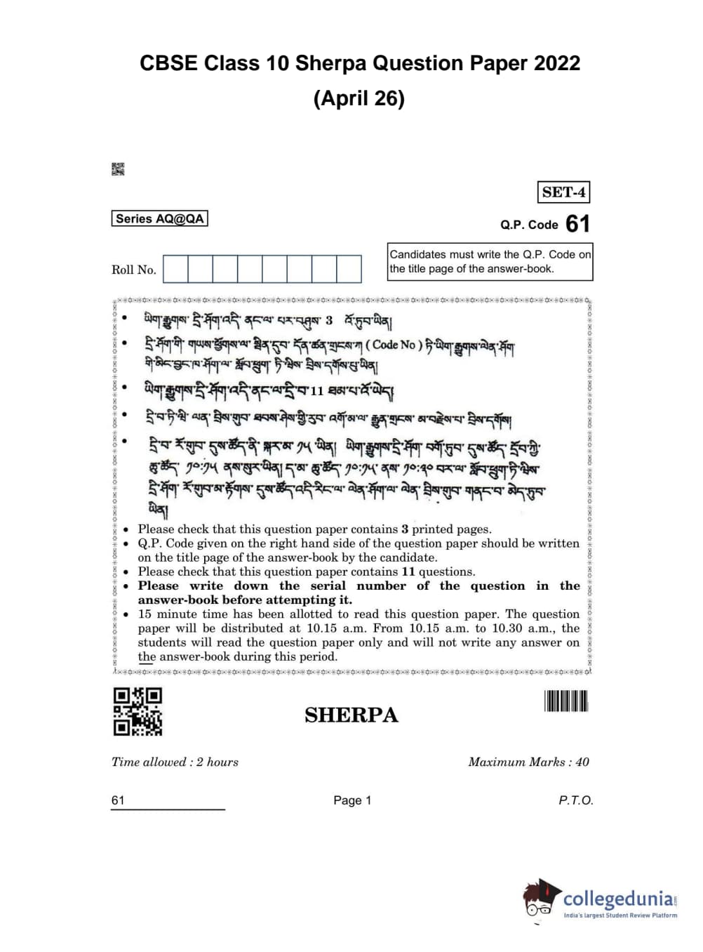 CBSE Class 10 Sherpa Question Paper 2022 with Answer Key Set 4 is available for download. The exam was conducted by the Central Board of Secondary Education on April 26, 2022 in the Morning Session 10:30 AM to 12:30 PM. The medium of paper was Sherpa. The question paper comprised a total of 11 questions divided among 2 sections.