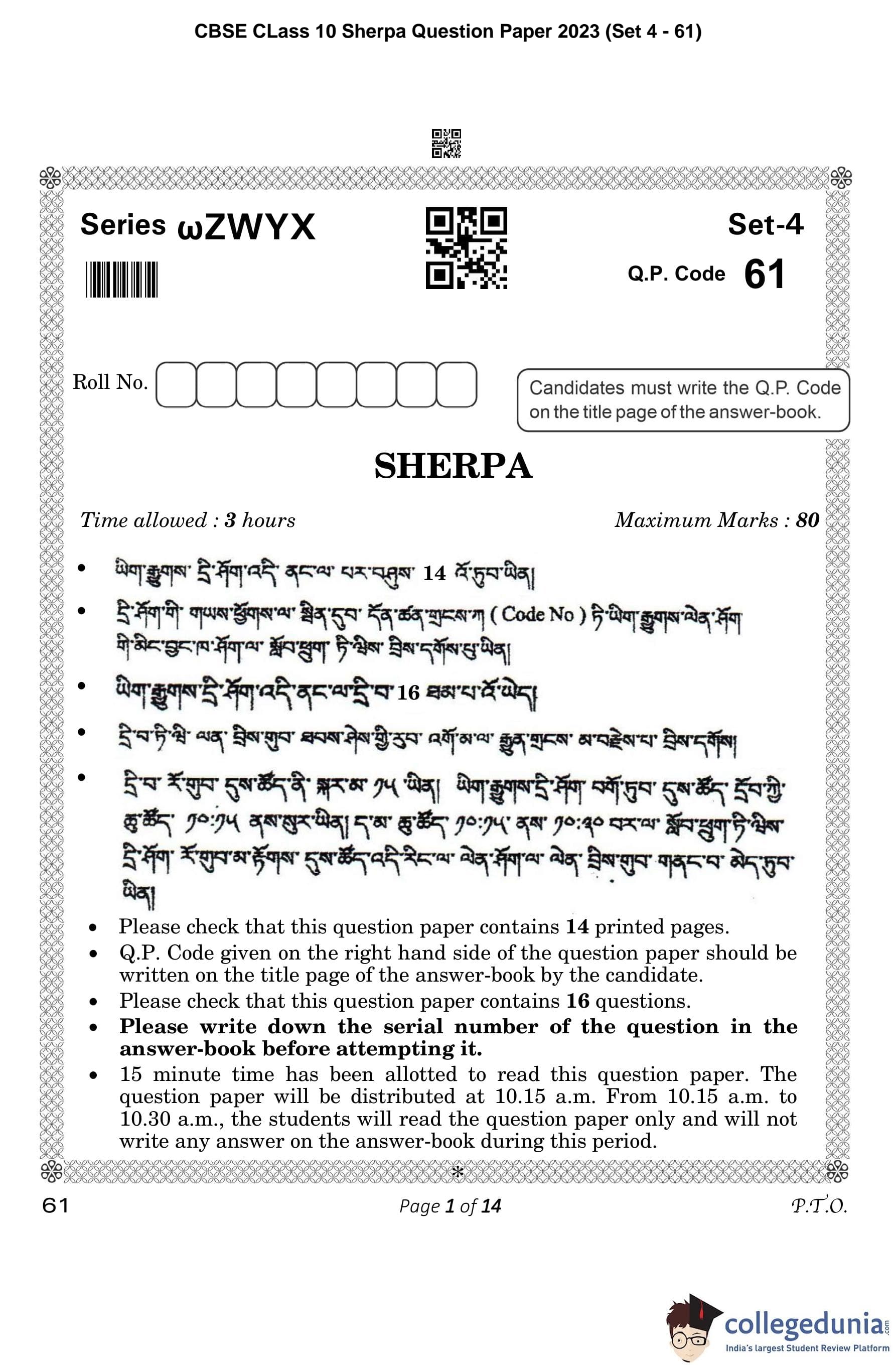 CBSE Class 10 Sherpa Question Paper 2023 (Set 4- 61) with Answer Key pdf is available for download here. The exam was conducted by Central Board of Secondary Education on February 15, 2023. The question paper comprised a total of 16 questions divided among 2 sections.