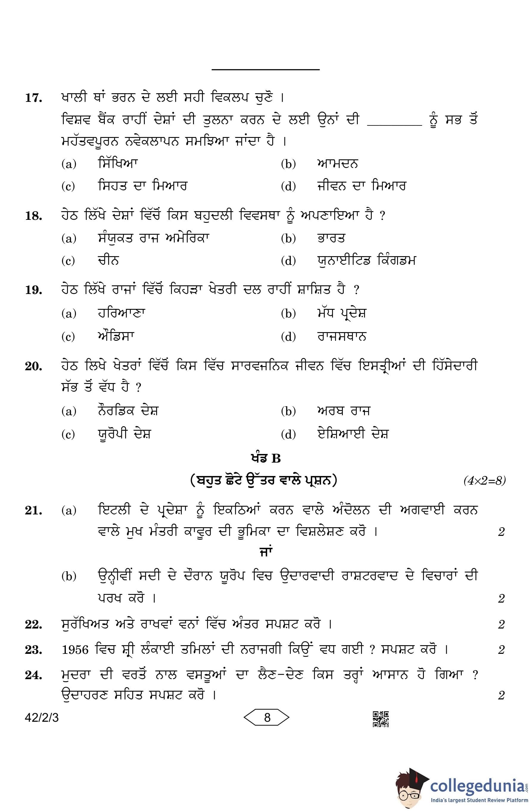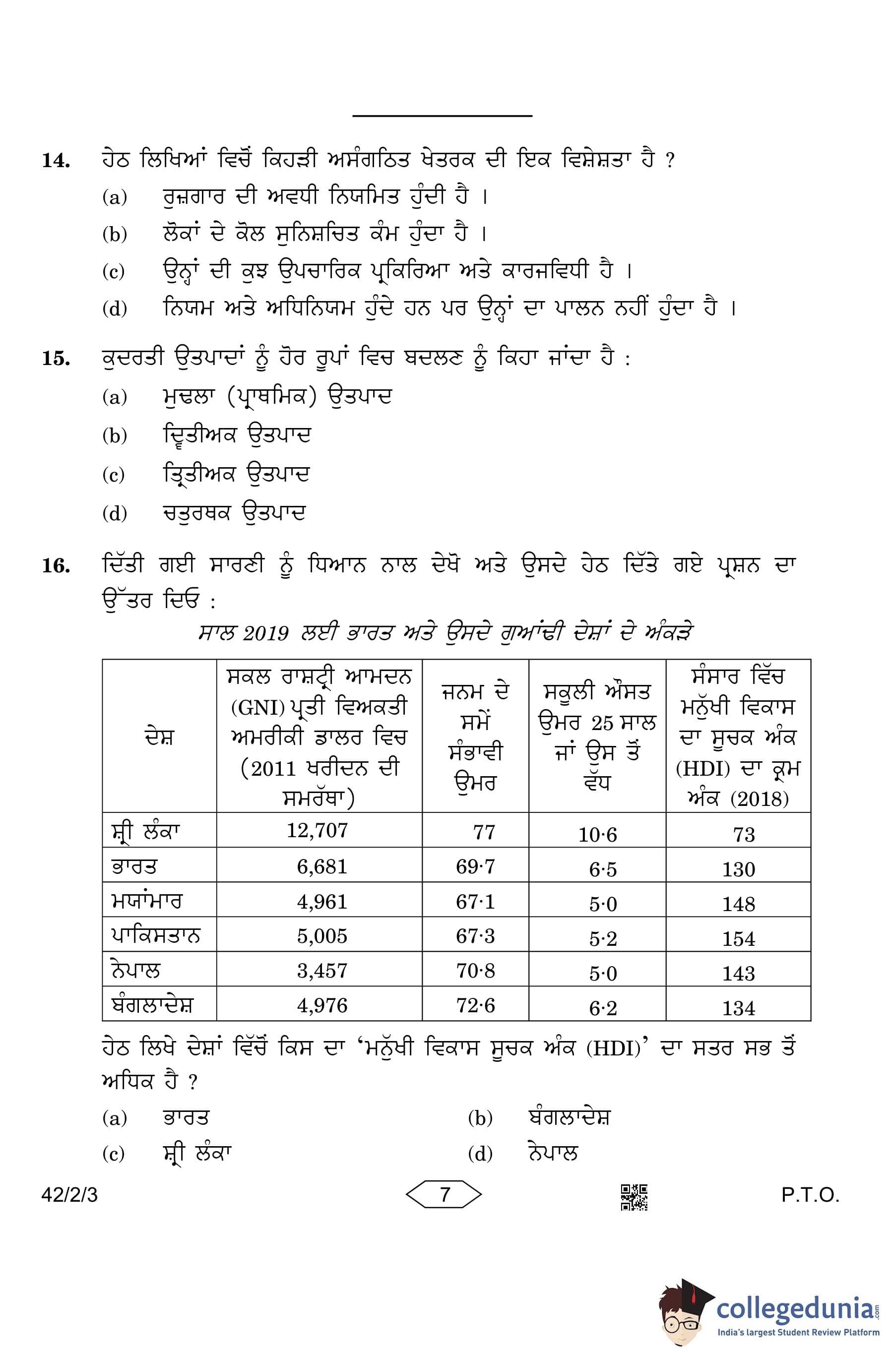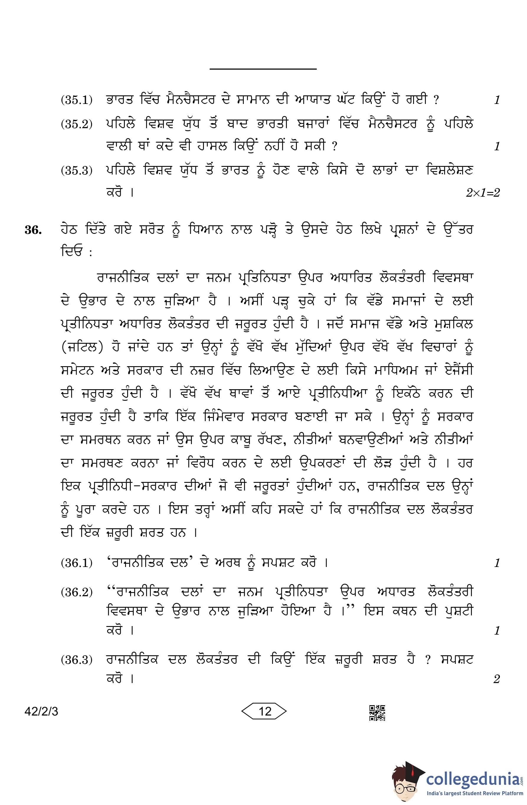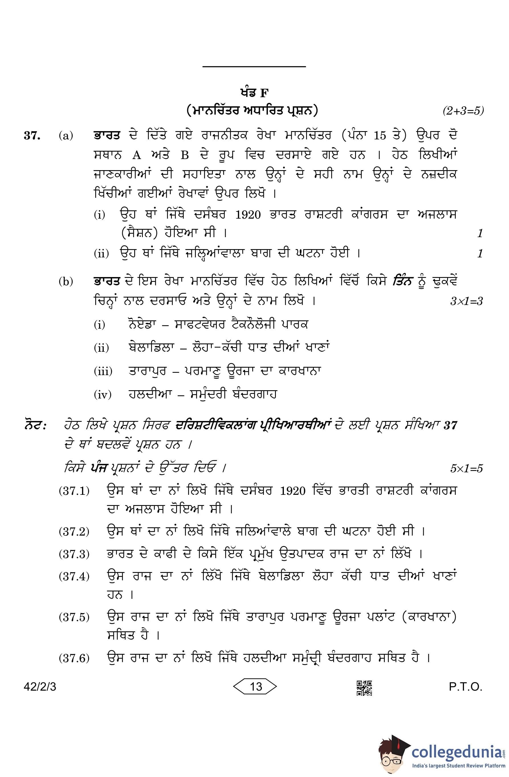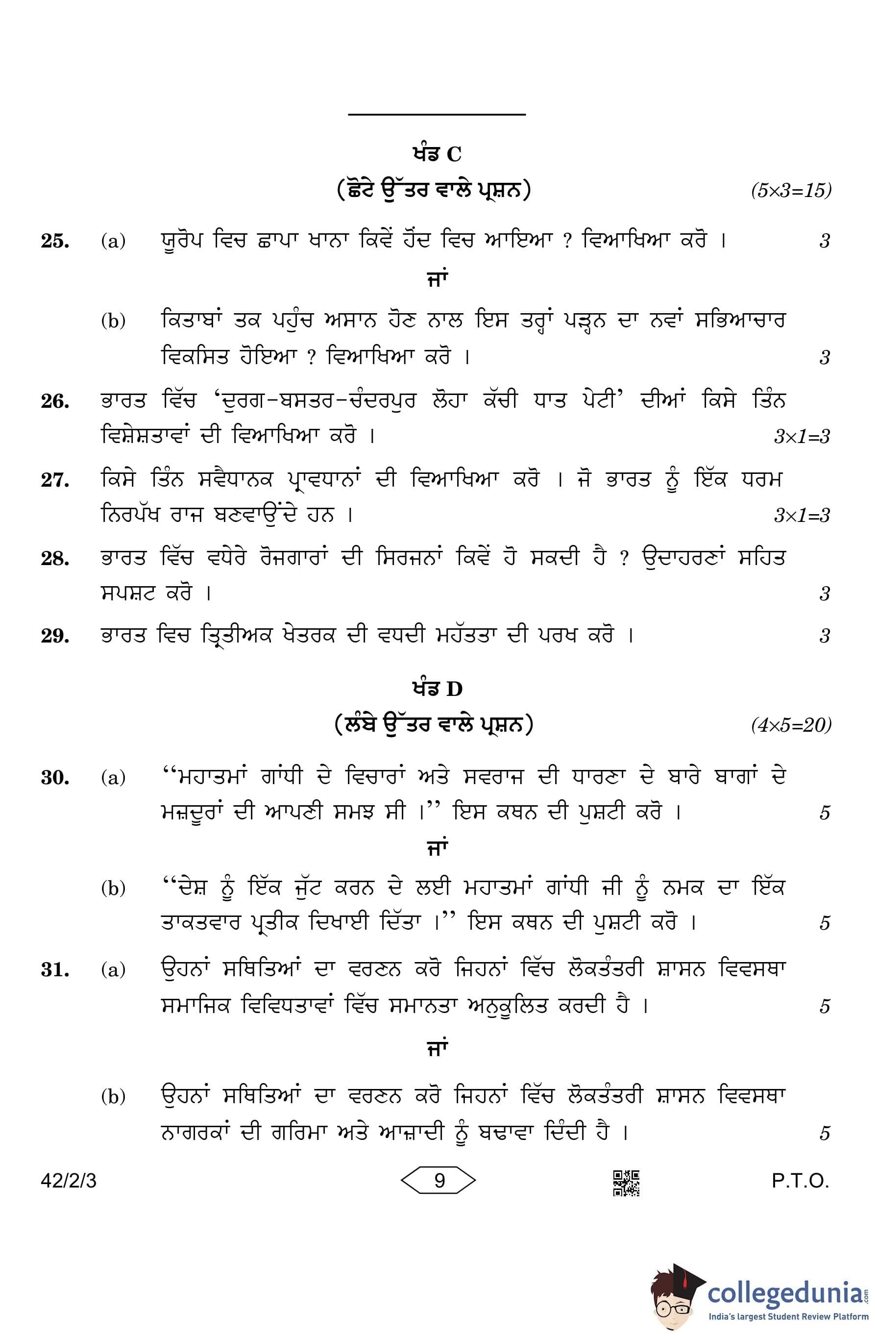 CBSE Class 10 Social Science (Set 3- 42/2/3) Punjabi Question Paper 2023 with Answer Key
