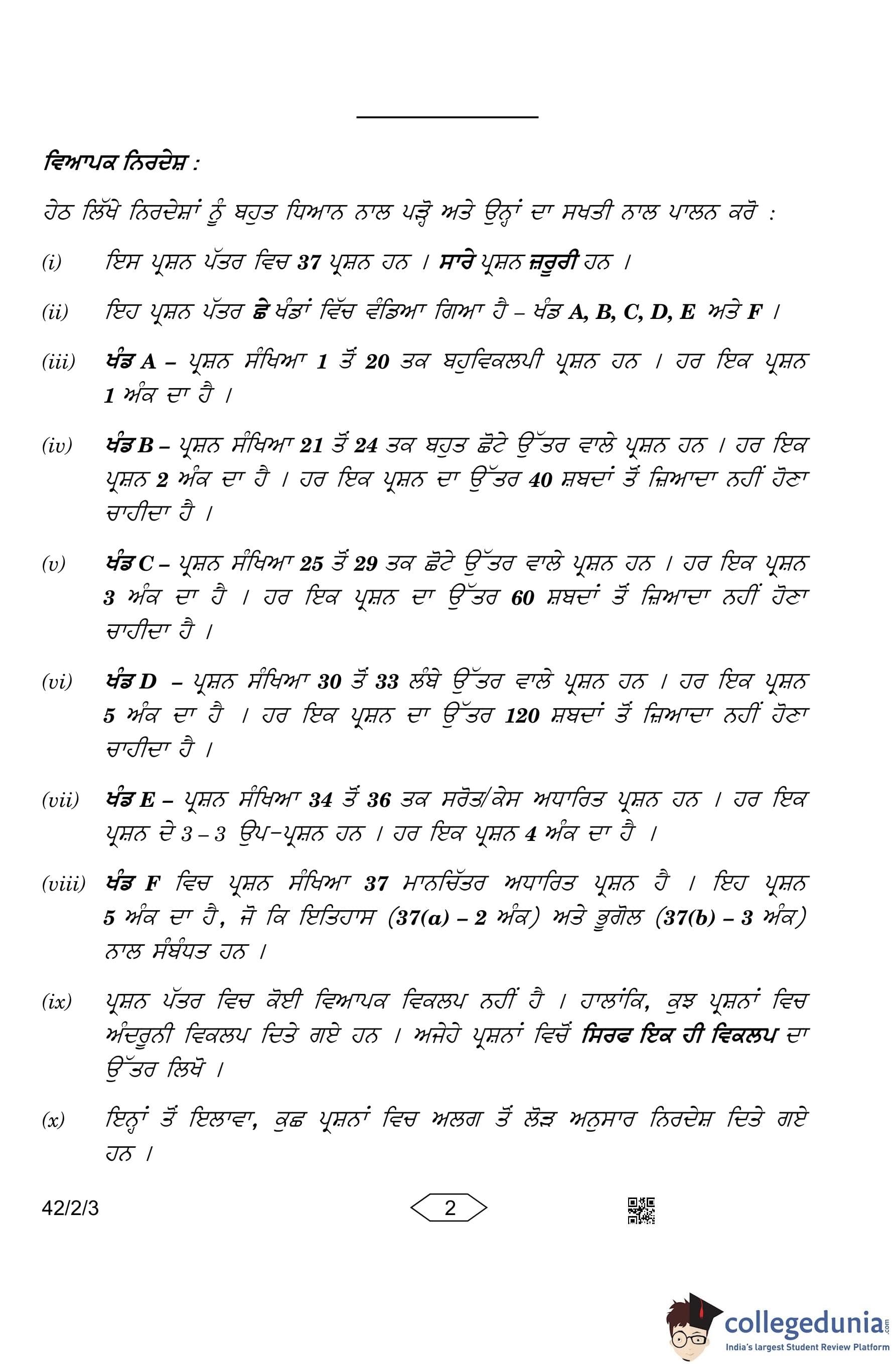 CBSE Class 10 Social Science Punjabi Question Paper 2023 with Answer Key (Set 3- 42/2/3) is available for download here. The exam was conducted by the Central Board of Secondary Education on March 15, 2023 in the Morning Session 10:30 AM to 1:30 PM. According to initial student reaction, the CBSE Class 10 Social Science Paper was rated as Moderate in difficulty level. The question paper comprised a total of 37 questions divided among 6 sections.