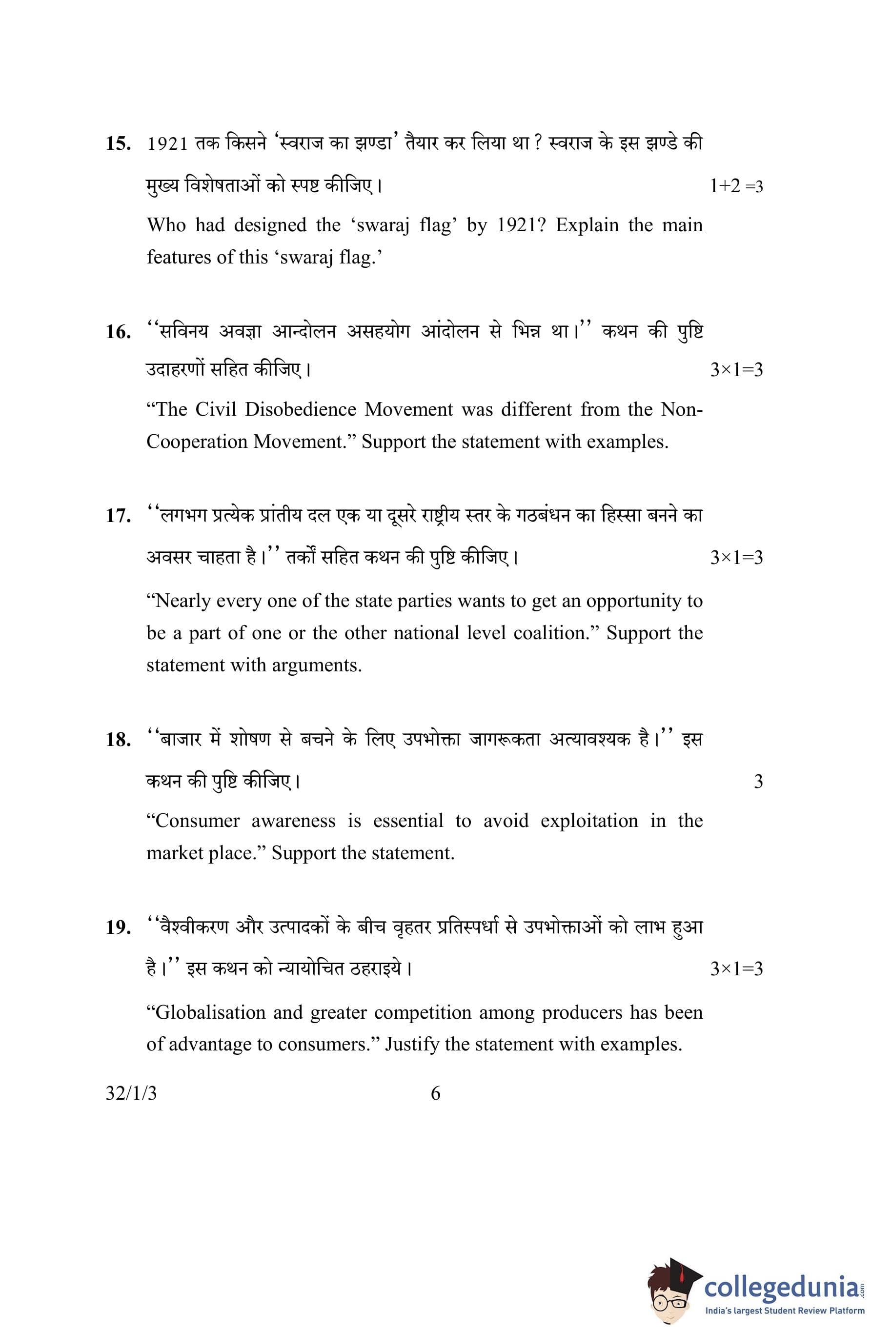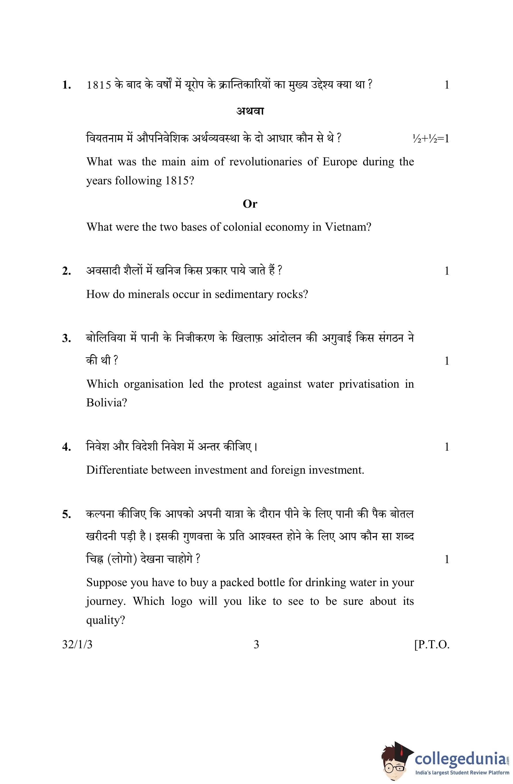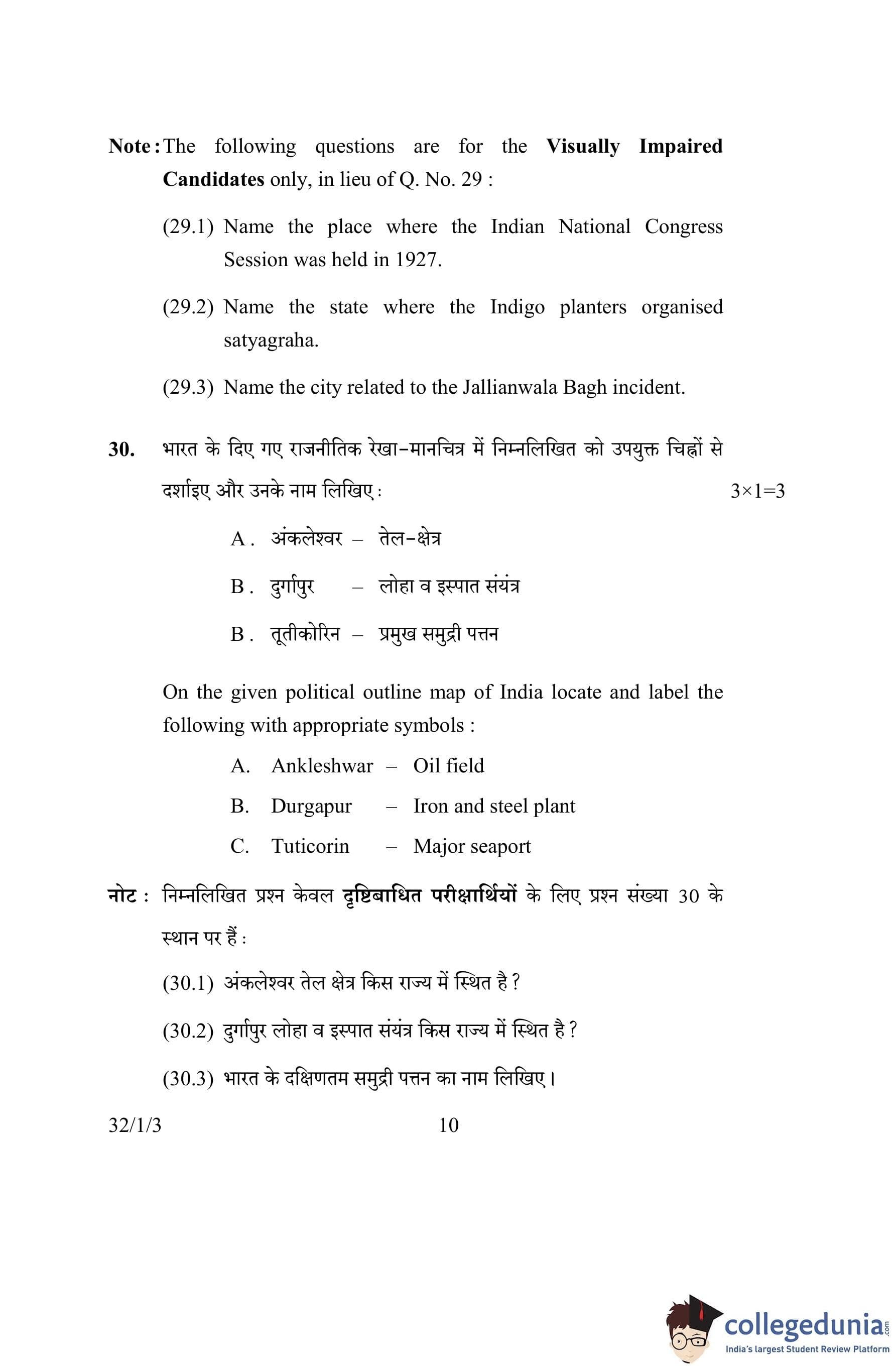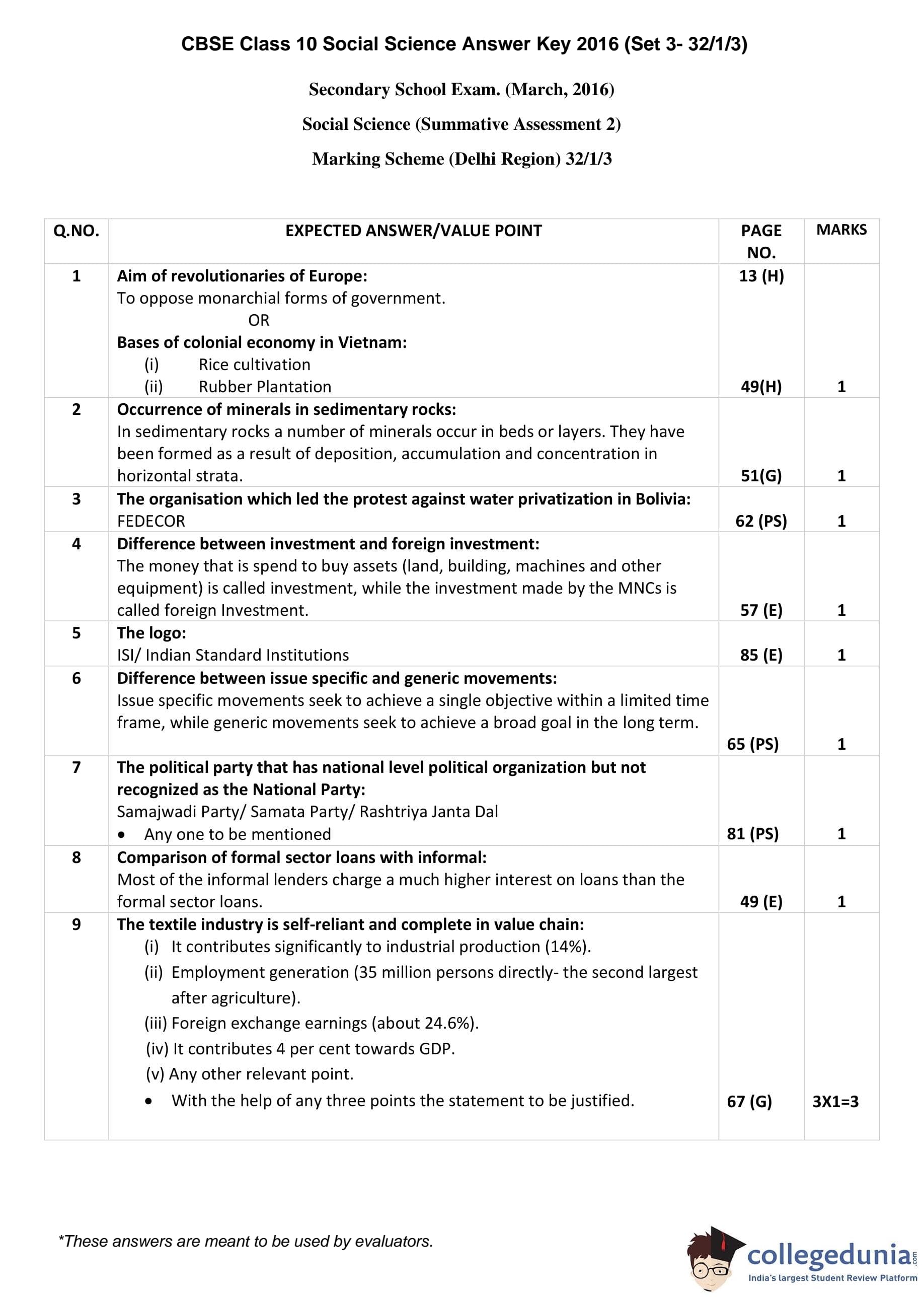 CBSE Class 10 Social Science Set 3- 32/1/3 Question Paper 2016 with Answer Key (March 10)