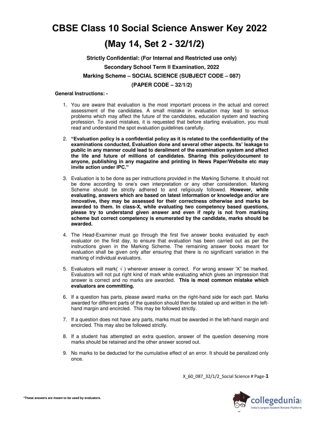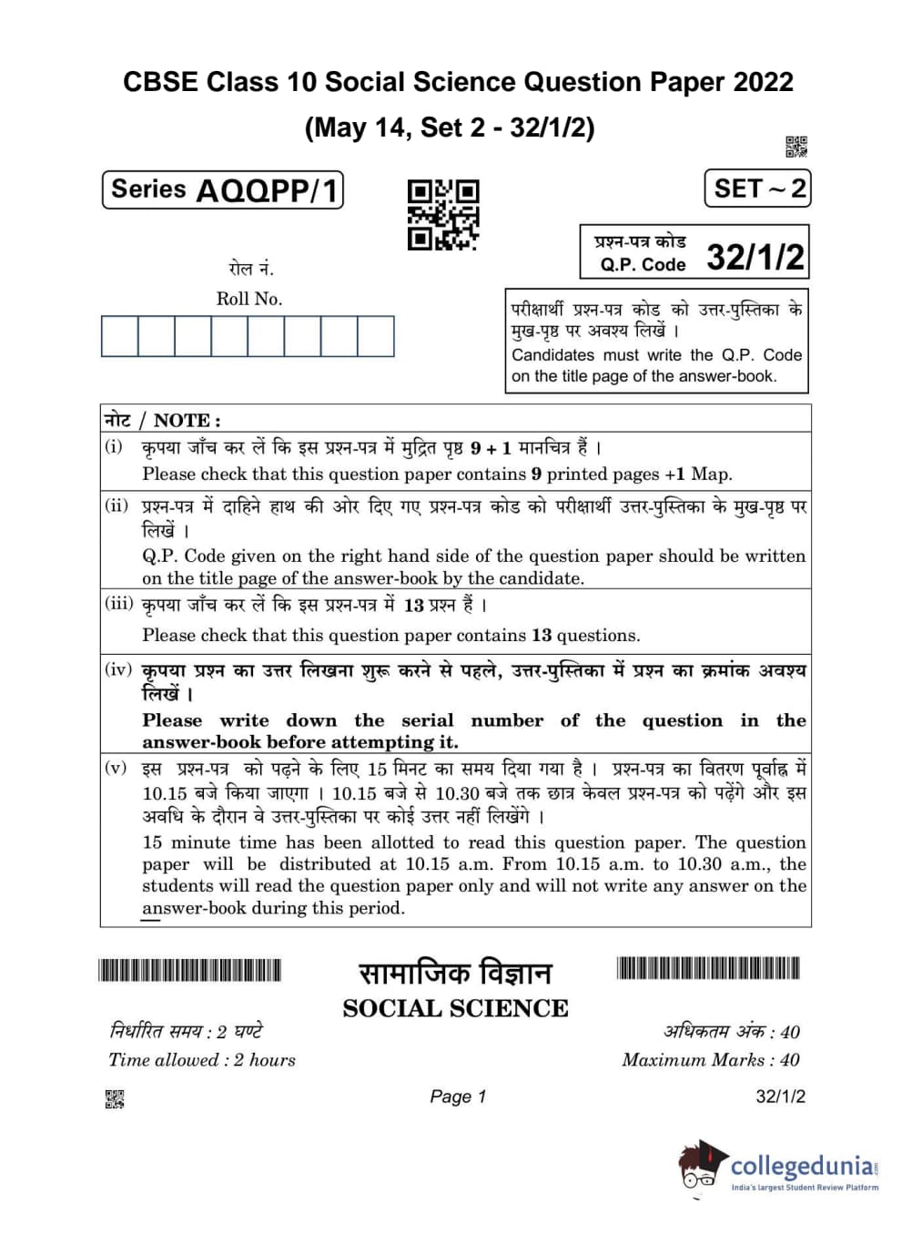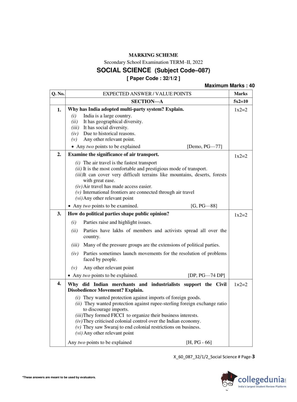 CBSE Class 10 Social Science Set 2 - 32/1/2 Question Paper 2022 with Answer Key (May 14)