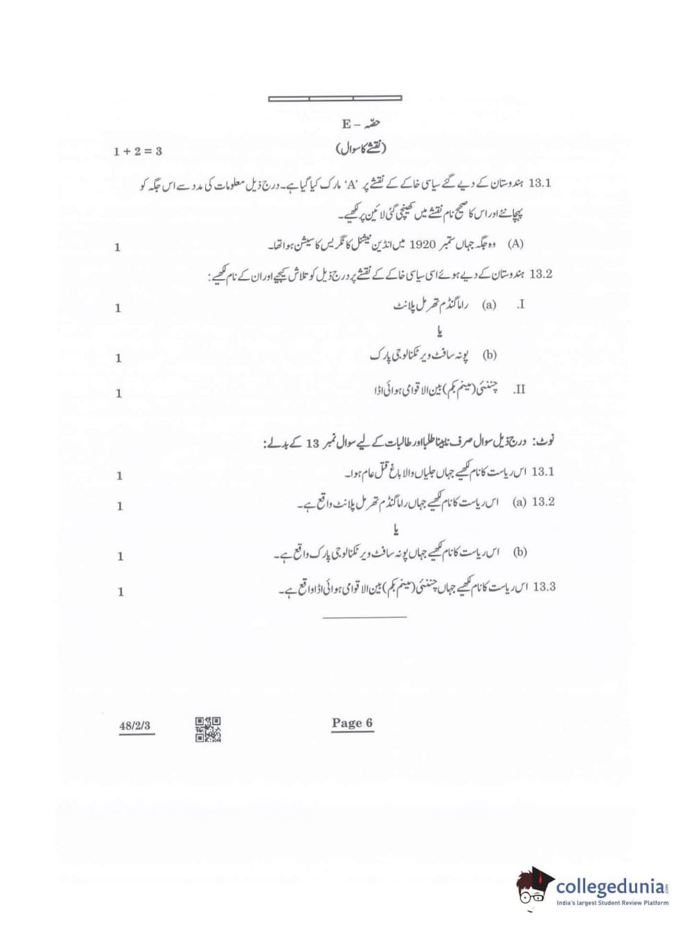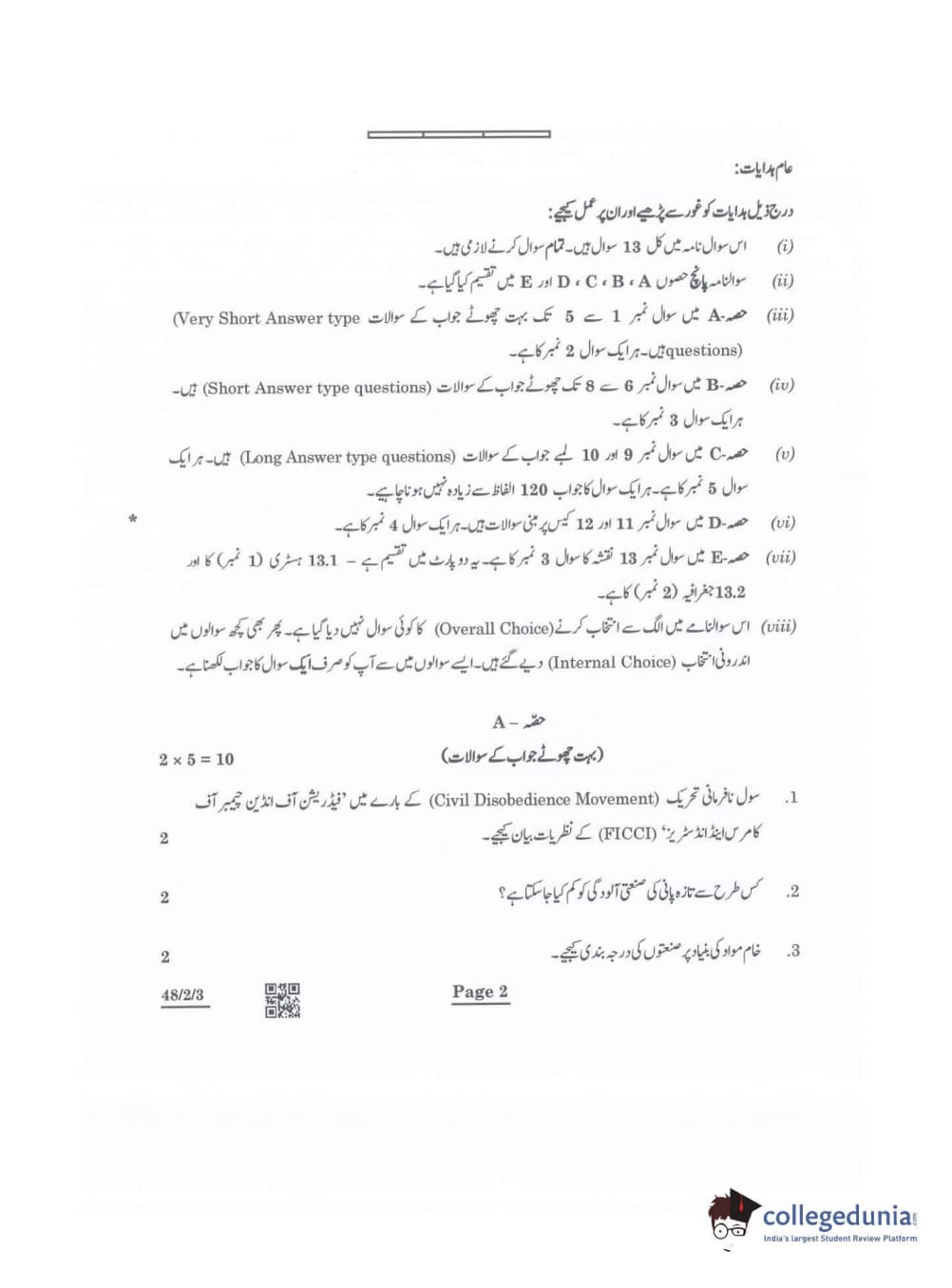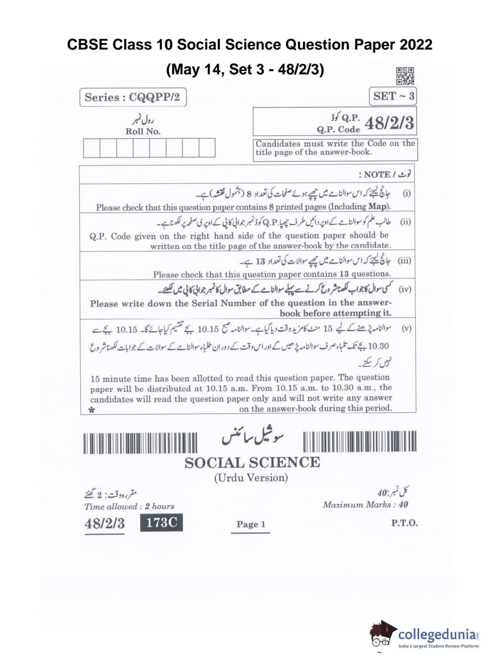 CBSE Class 10 Social Science Question Paper 2022 with Answer Key Set 3 - 48/2/3 is available for download. The exam was conducted by the Central Board of Secondary Education on May 14, 2022 in the Morning Session 10:30 AM to 12:30 PM. The medium of paper was Urdu. The question paper comprised a total of 13 questions divided among 5 sections.