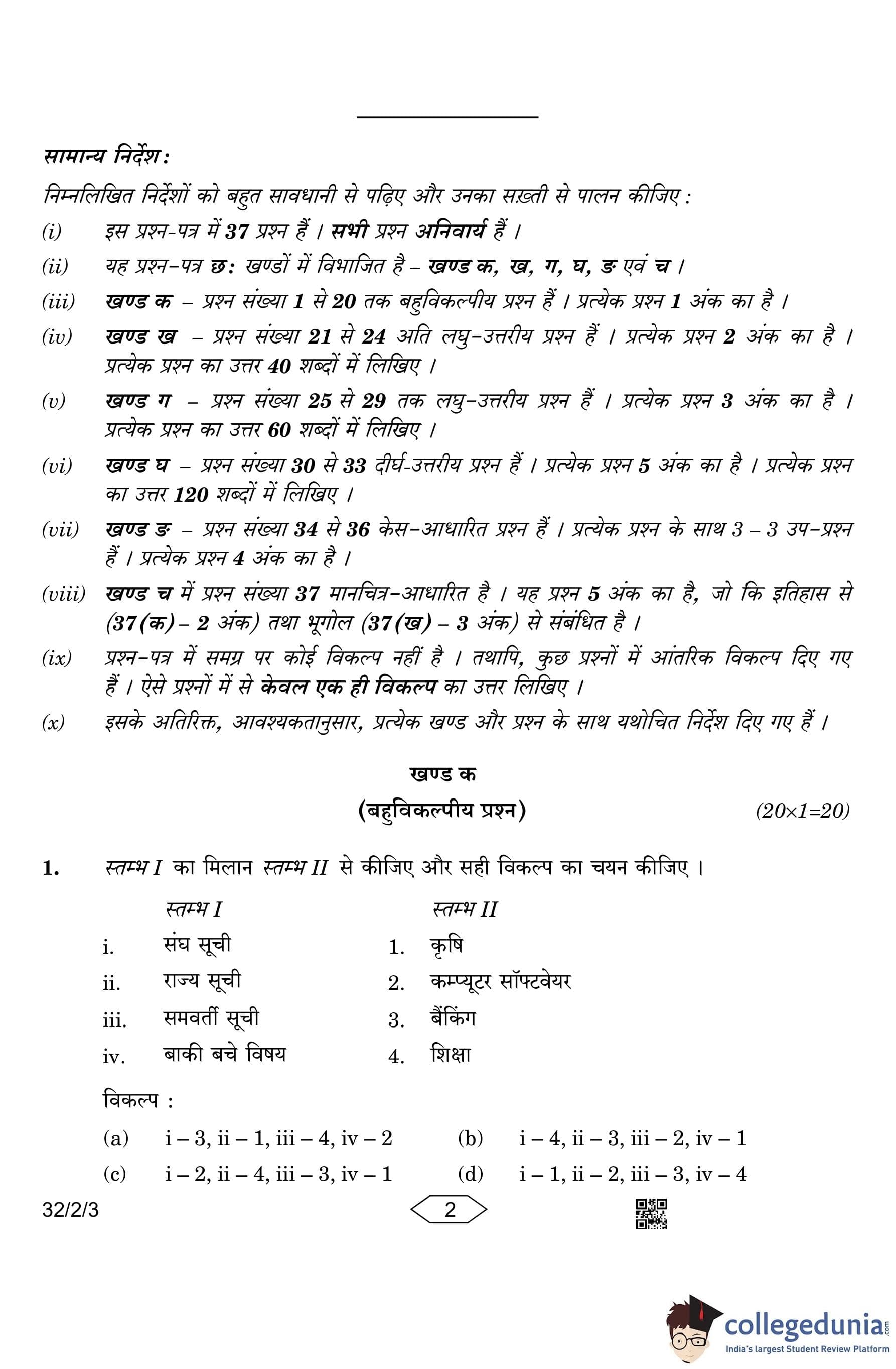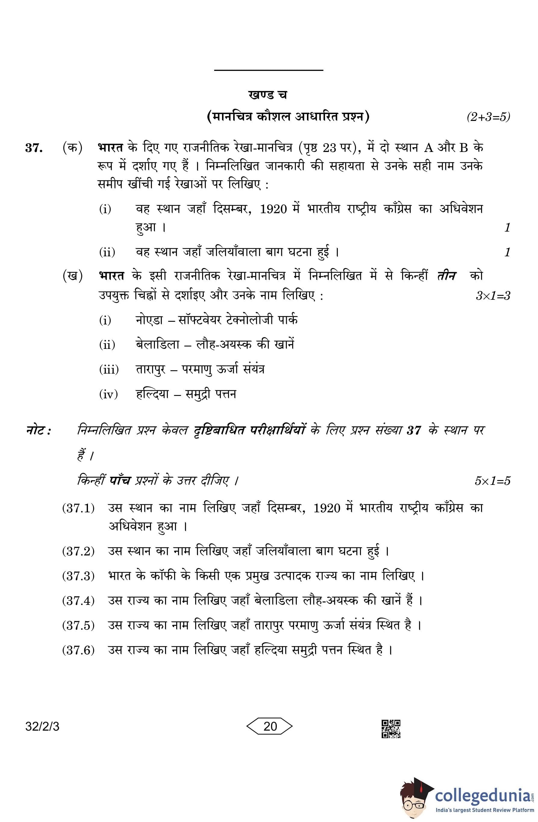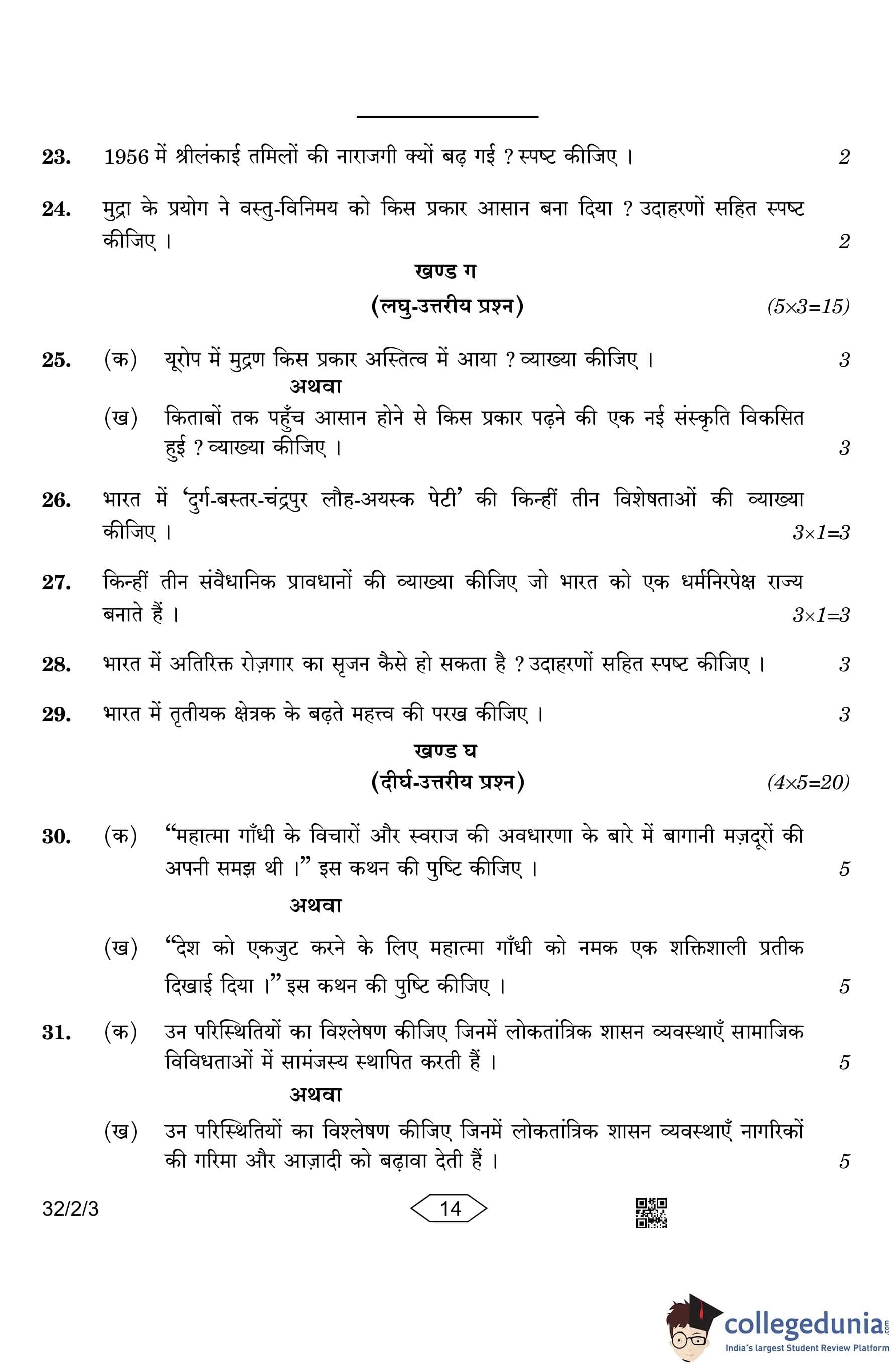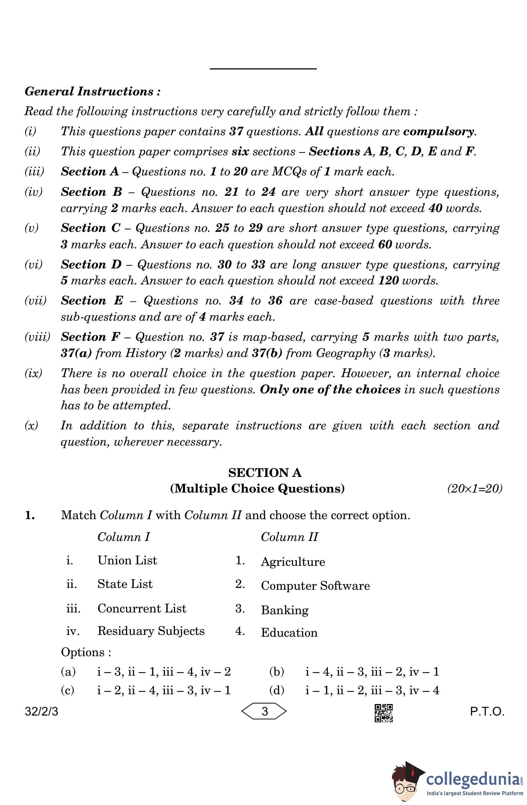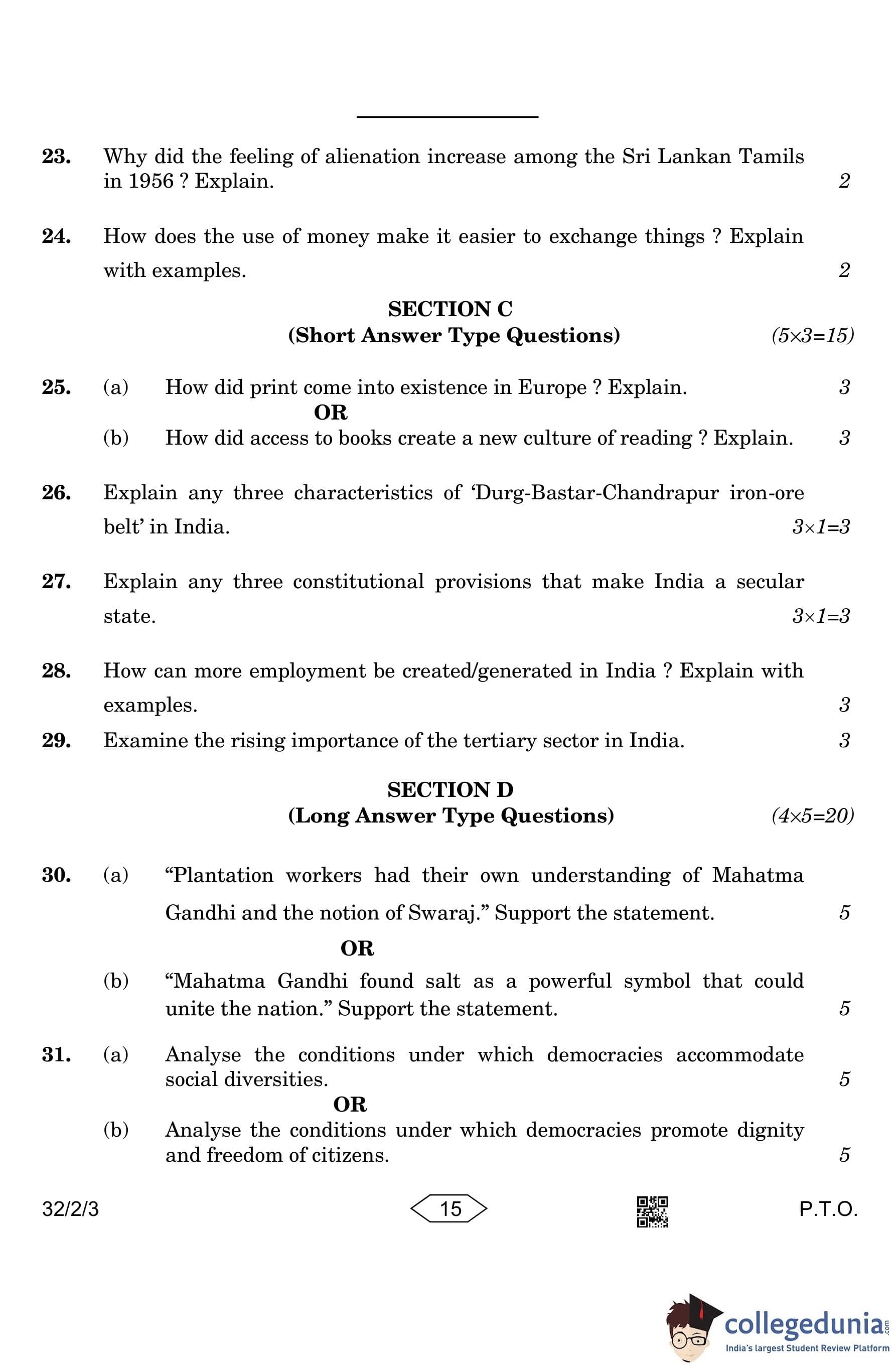 CBSE Class 10 Social Science Question Paper 2023 with Answer Key (Set 3- 32/2/3) is available for download here. The exam was conducted by the Central Board of Secondary Education on March 15, 2023 in the Morning Session 10:30 AM to 1:30 PM. The medium of paper was English & Hindi. According to initial student reaction, the CBSE Class 10 Social Science Paper was rated as Moderate in difficulty level. The question paper comprised a total of 37 questions divided among 6 sections.