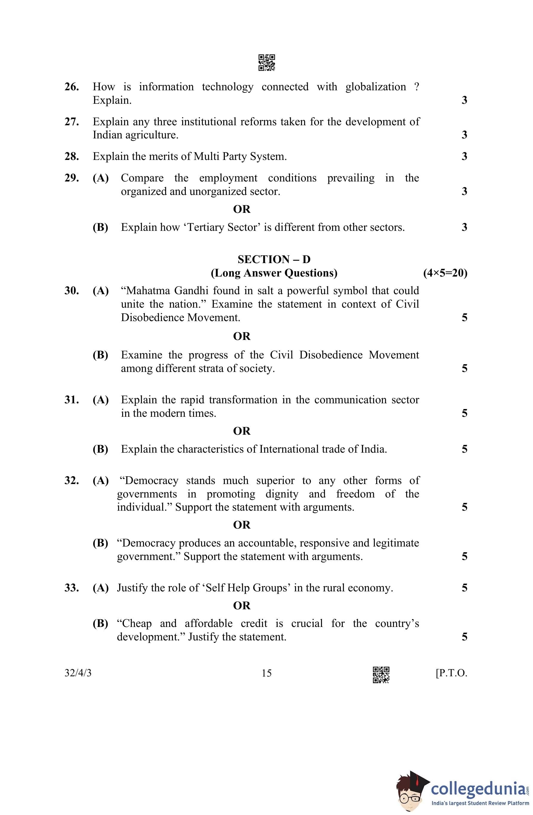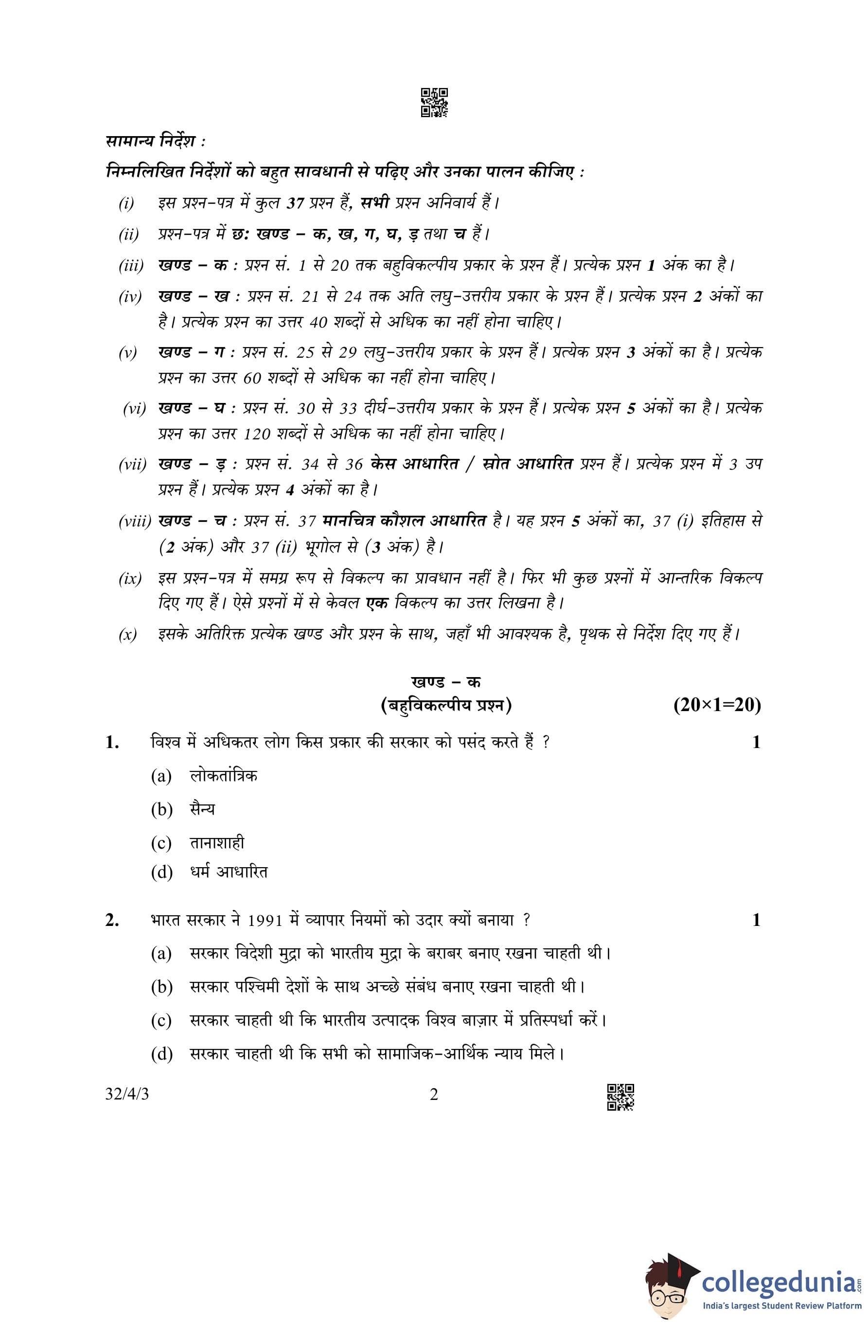 CBSE Class 10 Social Science Question Paper 2023 with Answer Key (Set 3- 32/4/3) is available for download here. The exam was conducted by the Central Board of Secondary Education on March 15, 2023 in the Morning Session 10:30 AM to 1:30 PM. The medium of paper was English & Hindi. According to initial student reaction, the CBSE Class 10 Social Science Paper was rated as Moderate in difficulty level. The question paper comprised a total of 37 questions divided among 6 sections.