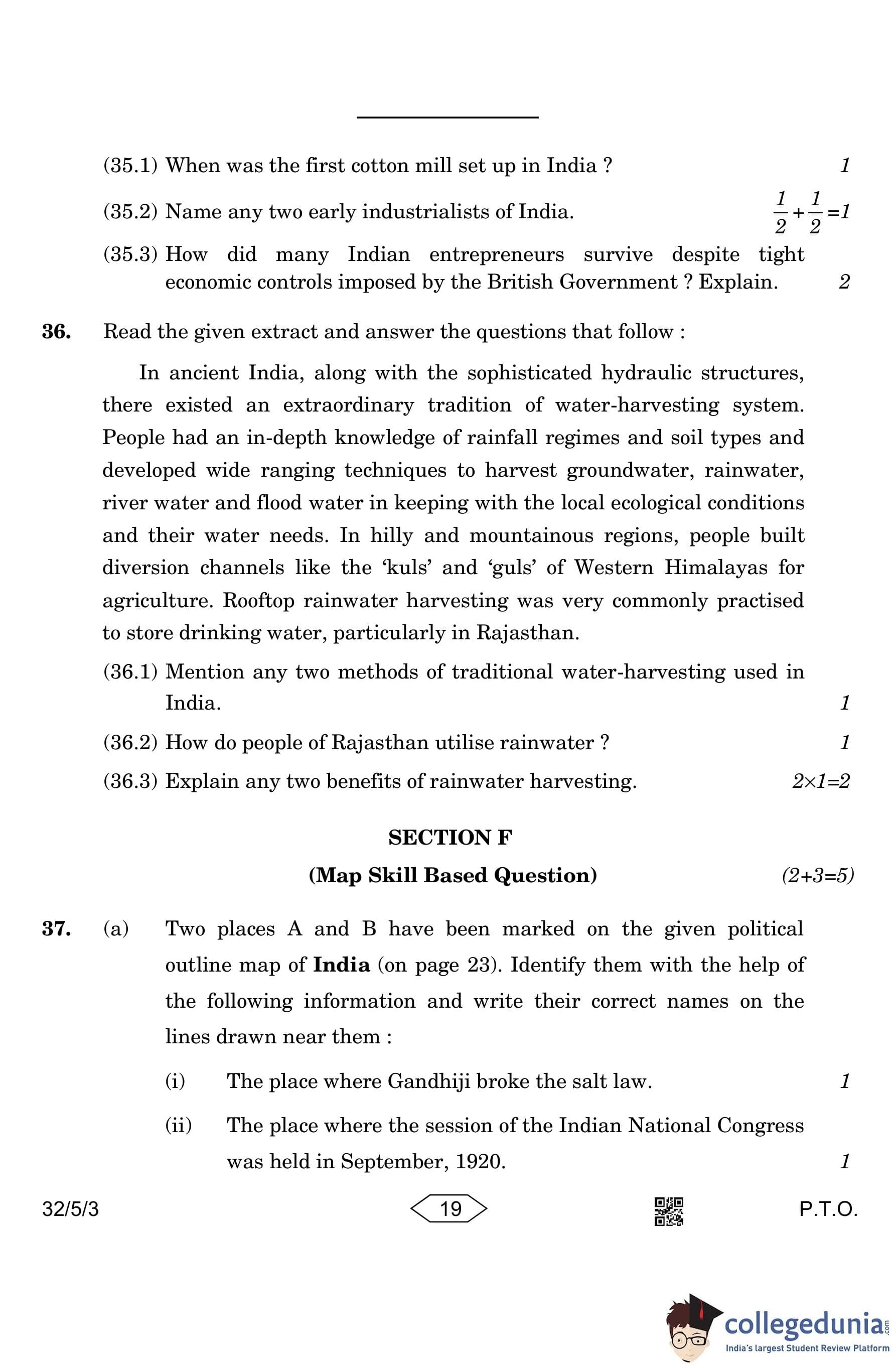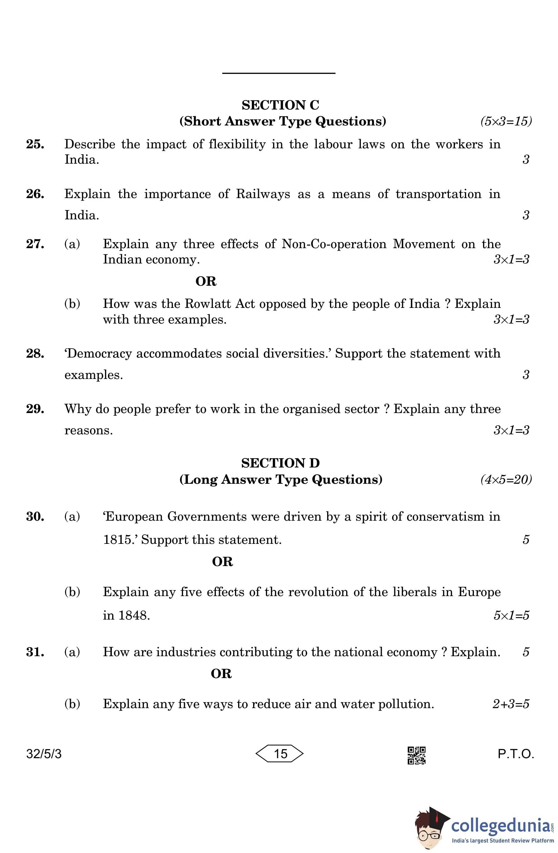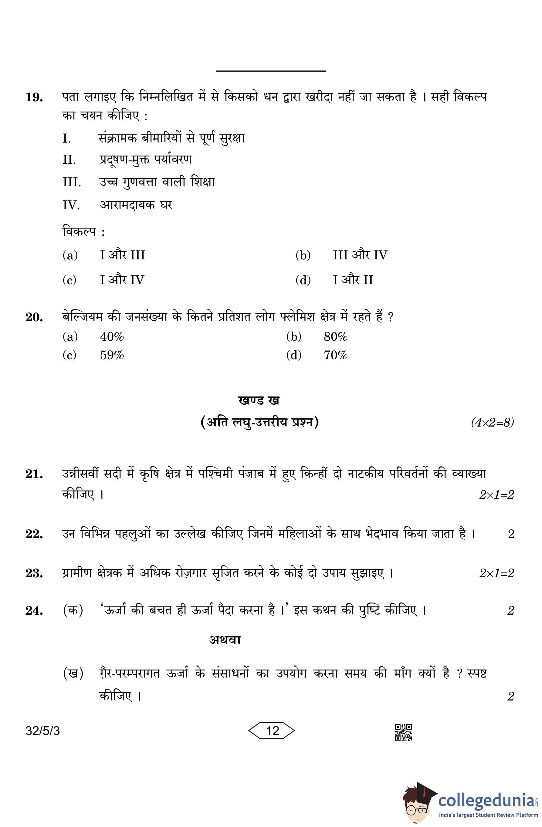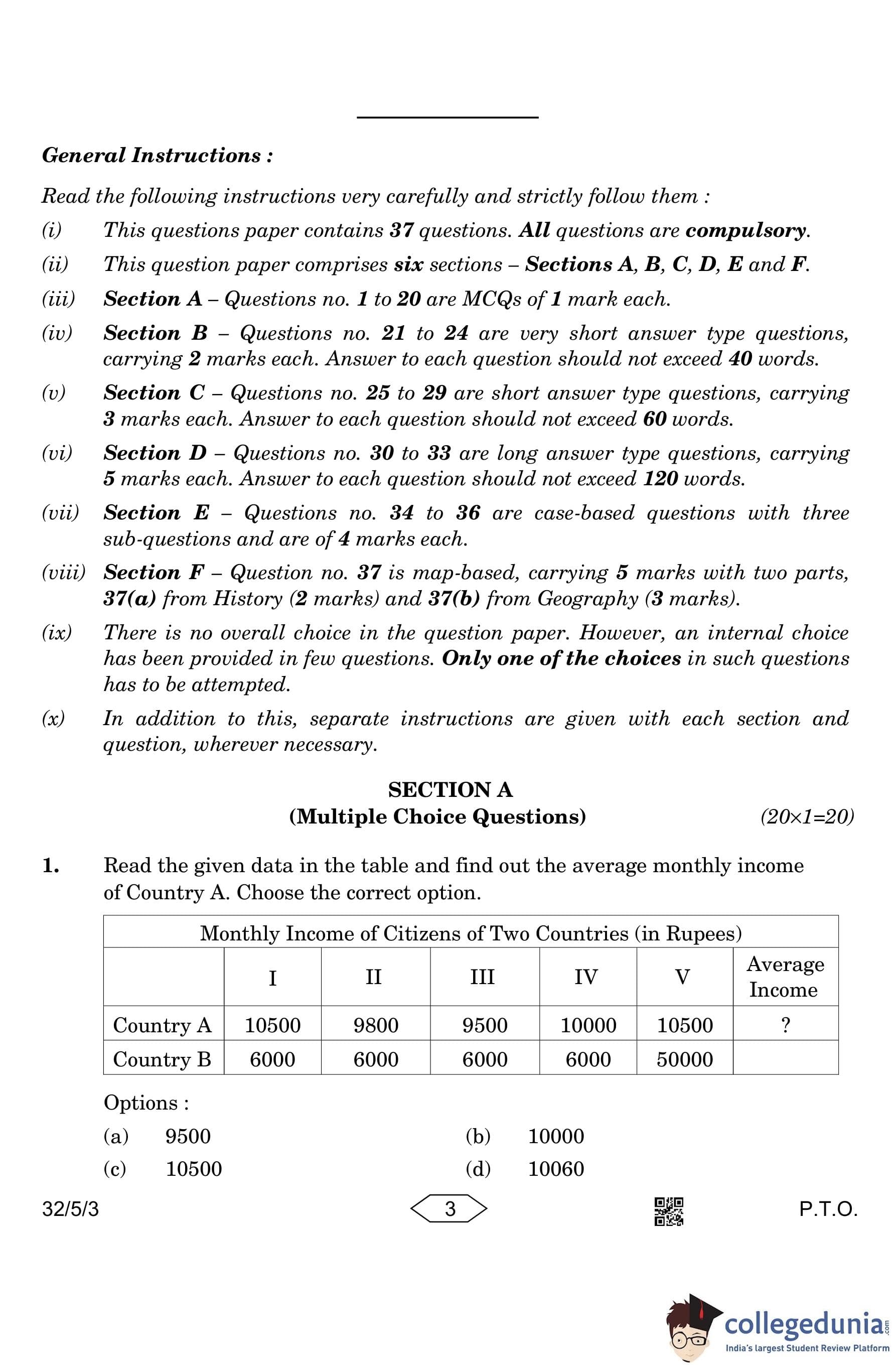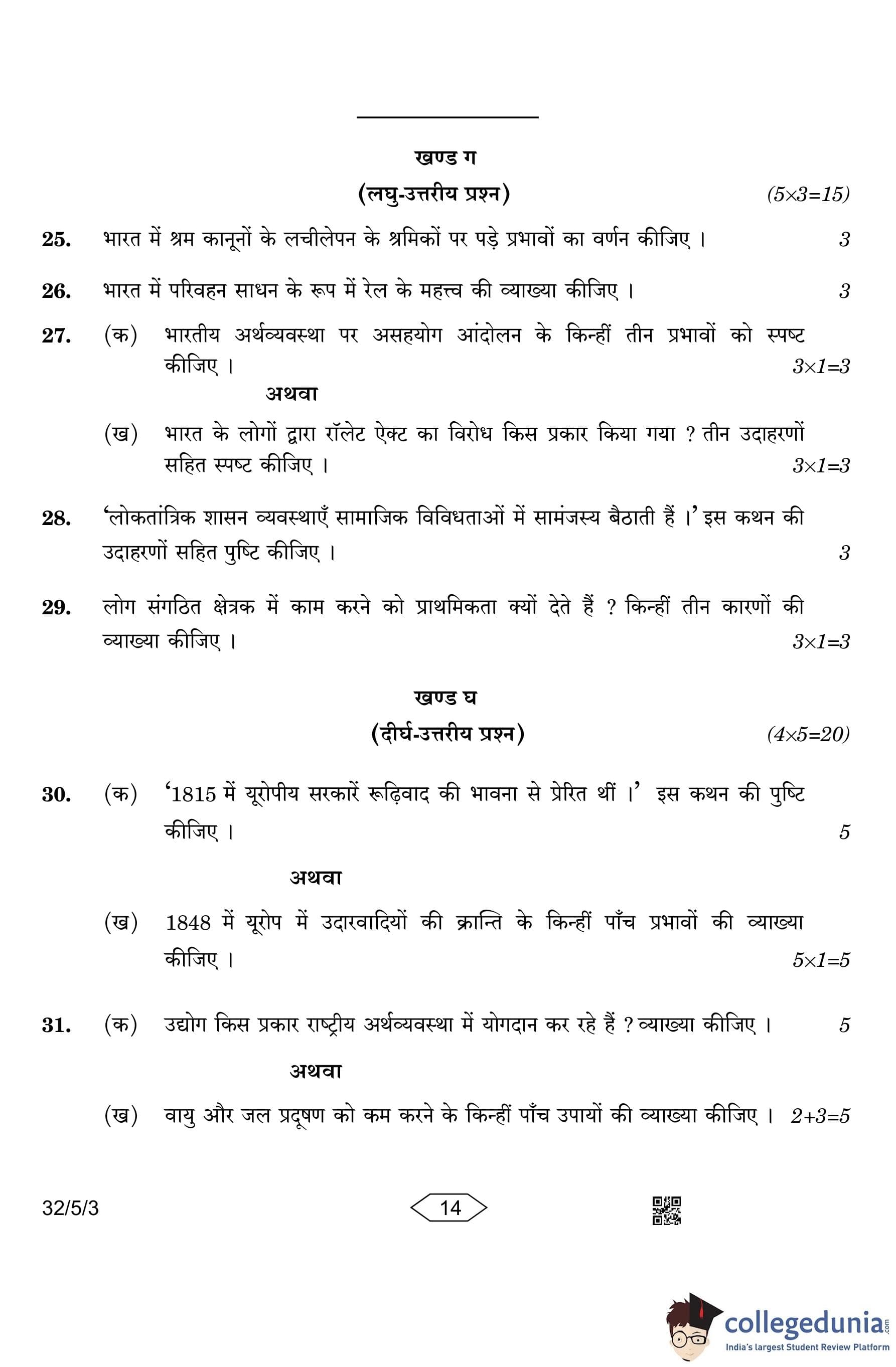 CBSE Class 10 Social Science Question Paper 2023 with Answer Key (Set 3- 32/5/3) is available for download here. The exam was conducted by the Central Board of Secondary Education on March 15, 2023 in the Morning Session 10:30 AM to 1:30 PM. The medium of paper was English & Hindi. According to initial student reaction, the CBSE Class 10 Social Science Paper was rated as Moderate in difficulty level. The question paper comprised a total of 37 questions divided among 6 sections.