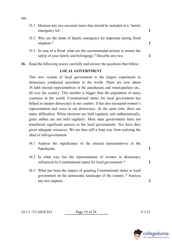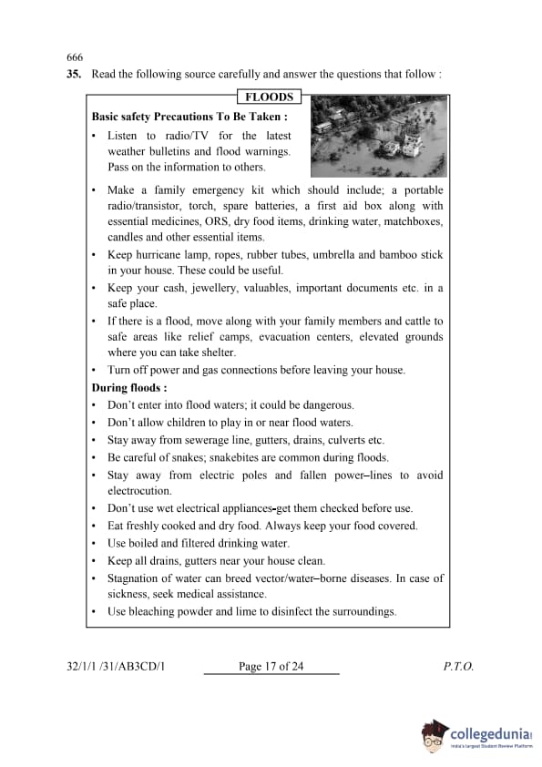 | 35.1 Mention any two essential items that should be included in a ‘family emergency kit’ during floods. | Radio and Food Supplies | 1. A portable radio to stay updated with flood warnings. 2. Dry food items and clean drinking water for survival during emergencies. |