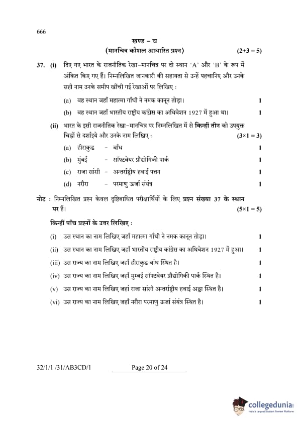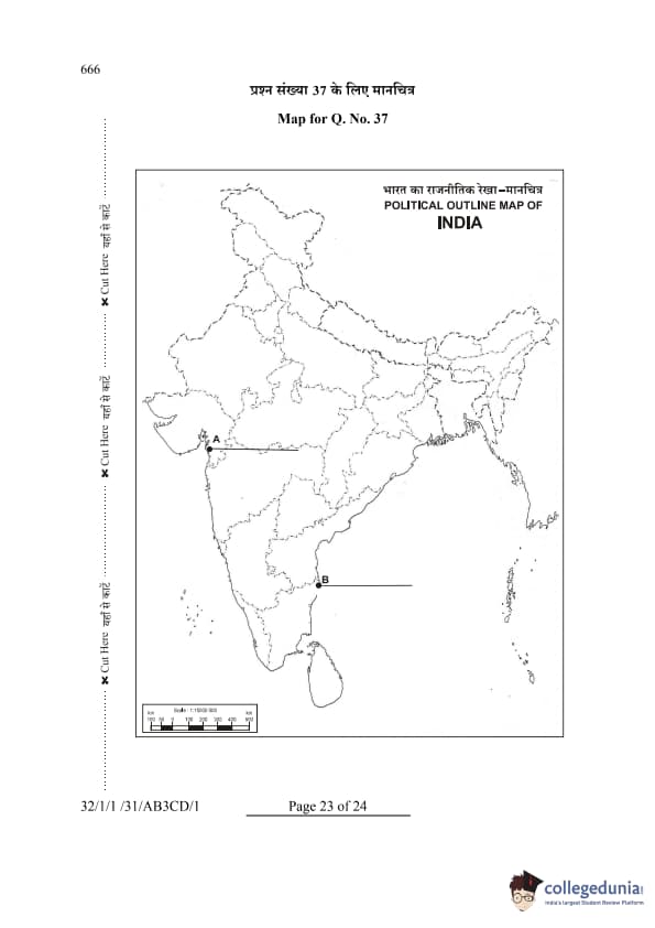 | 37. (i) Two places ‘A’ and ‘B’ have been marked on the given political outline map of India. Identify them with the following information: (a) The place where Mahatma Gandhi broke the salt law. (b) The place where a session of the Indian National Congress was held in 1927. |