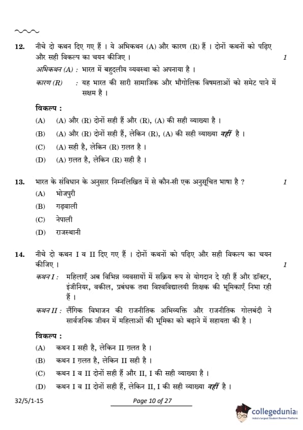 | 12. Two statements are given below: Assertion (A) and Reason (R). Select the correct option: Assertion (A): India has adopted a multi-party system. Reason (R): It effectively accommodates the social and geographical diversity of the country. (A) Both (A) and (R) are true, and (R) is the correct explanation of (A) (B) Both (A) and (R) are true, but (R) is not the correct explanation of (A) (C) (A) is true, but (R) is false (D) (A) is false, but (R) is true |