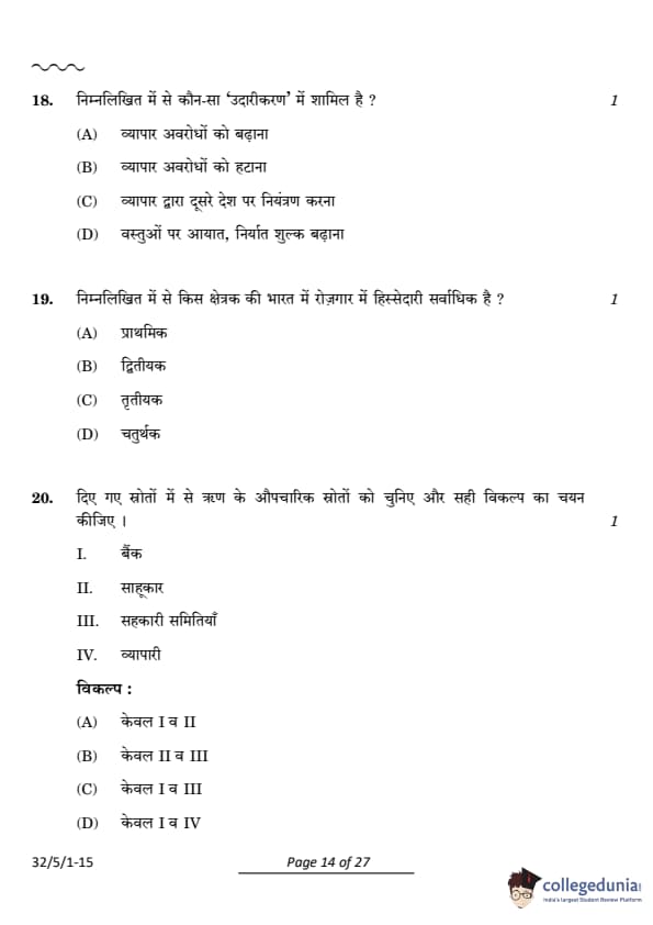 | 20. Select the formal sources of credit from the given options: 1. Bank 2. Moneylender 3. Cooperatives 4. Businessman (A) Only I and II (B) Only II and III (C) Only I and III (D) Only I and IV |