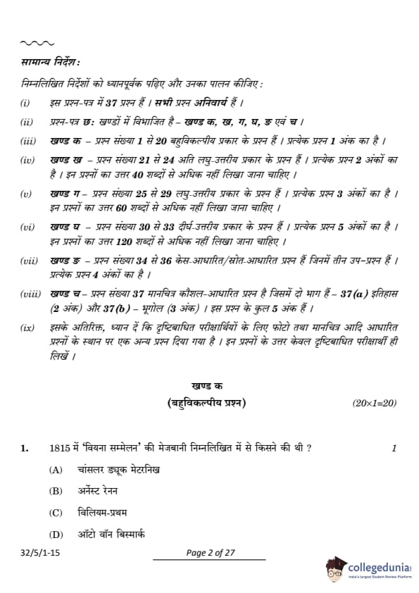 | 1. Who among the following hosted the ‘Vienna Congress’ in 1815? (A) Chancellor Duke Metternich (B) Ernst Renan (C) William I (D) Otto von Bismarck |