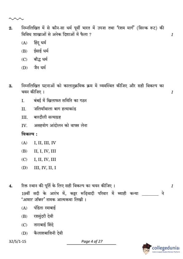 | 3. Arrange the following events in chronological order: I. Formation of Khilafat Committee in Bombay II. Jallianwala Bagh Massacre III. Bardoli Satyagraha IV. Withdrawal of Non-Cooperation Movement (A) I, II, III, IV (B) II, I, IV, III (C) I, II, IV, III (D) III, IV, II, I |